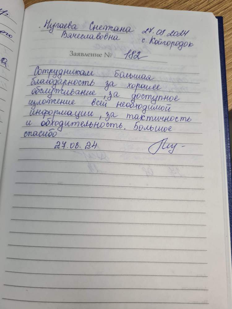 27.08.2024 Сотрудникам большая благодарность за хорошее обслуживание, за доступное изложение всей необходимой информации, за тактичность и обходительность. Большое спасибо