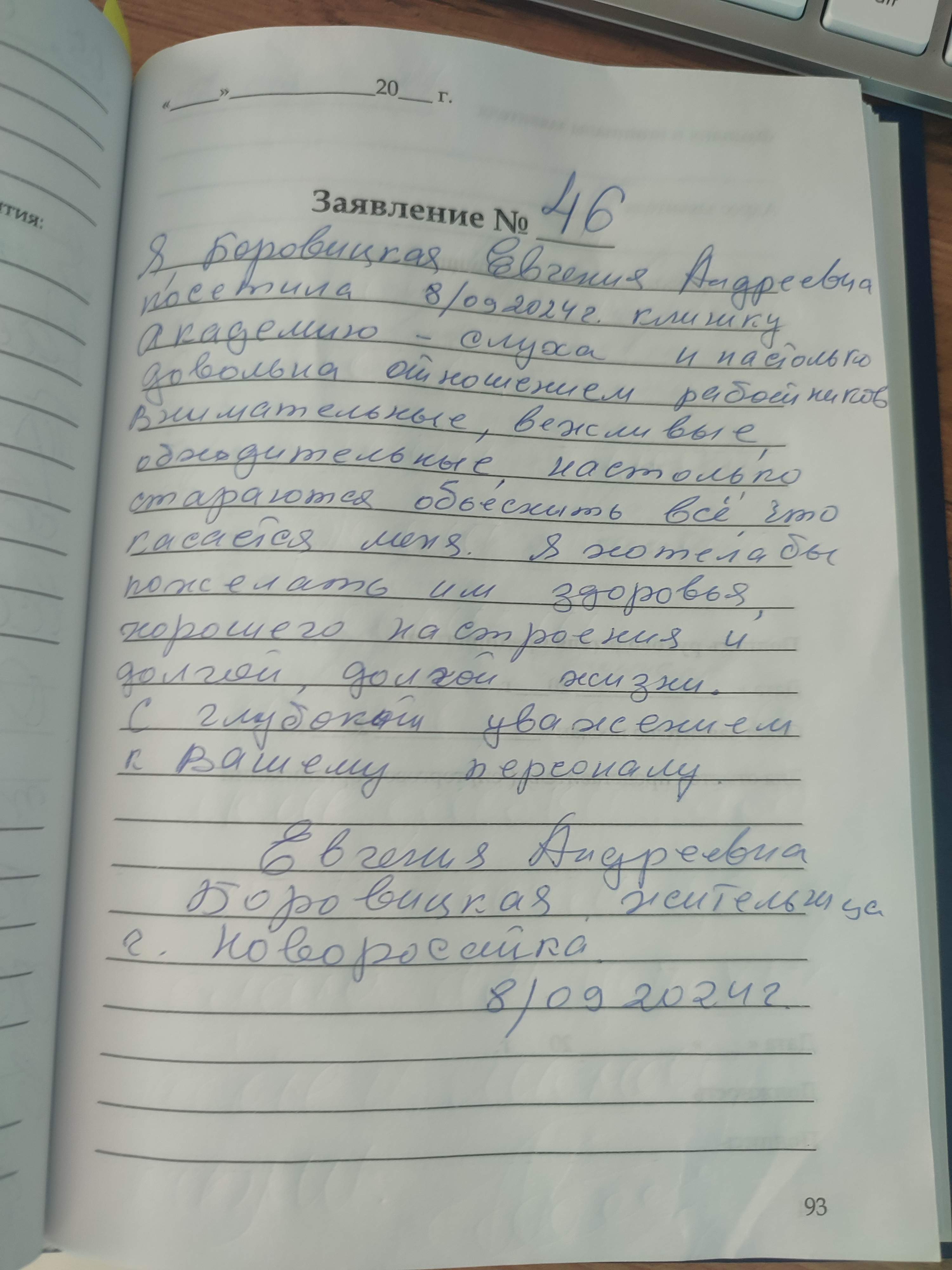 Я, Боровицкая Евгения Андреевна посетила 08.09.2024г.клинику Академия Слуха и настолько довольна отношением работников.Внимательные.вежливые,обходительные,настолько стараются объяснить все,что касается меня. Я хотела бы пожелать им здоровья,хорошего настроения,и долгой,долгой жизни.С глубоким уважением к Вашему персоналу. Евгения Андреевна Боровицкая жительница г. Новороссийска. 08.09.2024г.