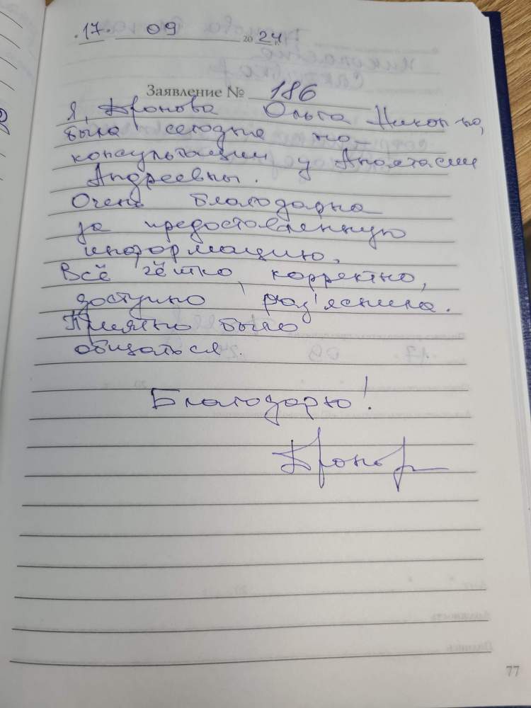 17.09.2024 Я, Дронова Ольга Николаевна, была сегодня на консультации у Анастасии Андреевны. Очень благодарна за предоставленную информацию. Всё четко, корректно, доступно разъяснила. Приятно было общаться. Благодарю!