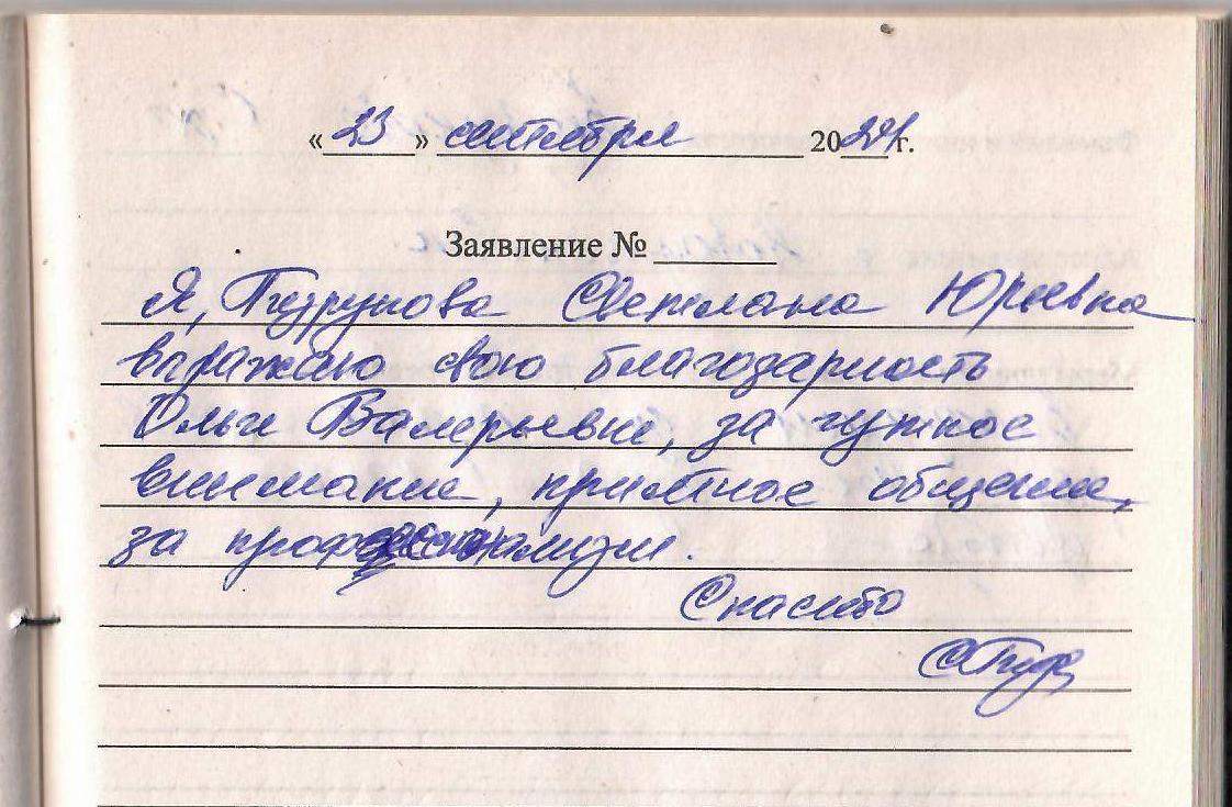 Я, Безрукова Светлана Юрьевна, выражаю свою благодарность Ольге Валерьевне за чуткое внимание приятное общение за профессионализм. Спасибо.