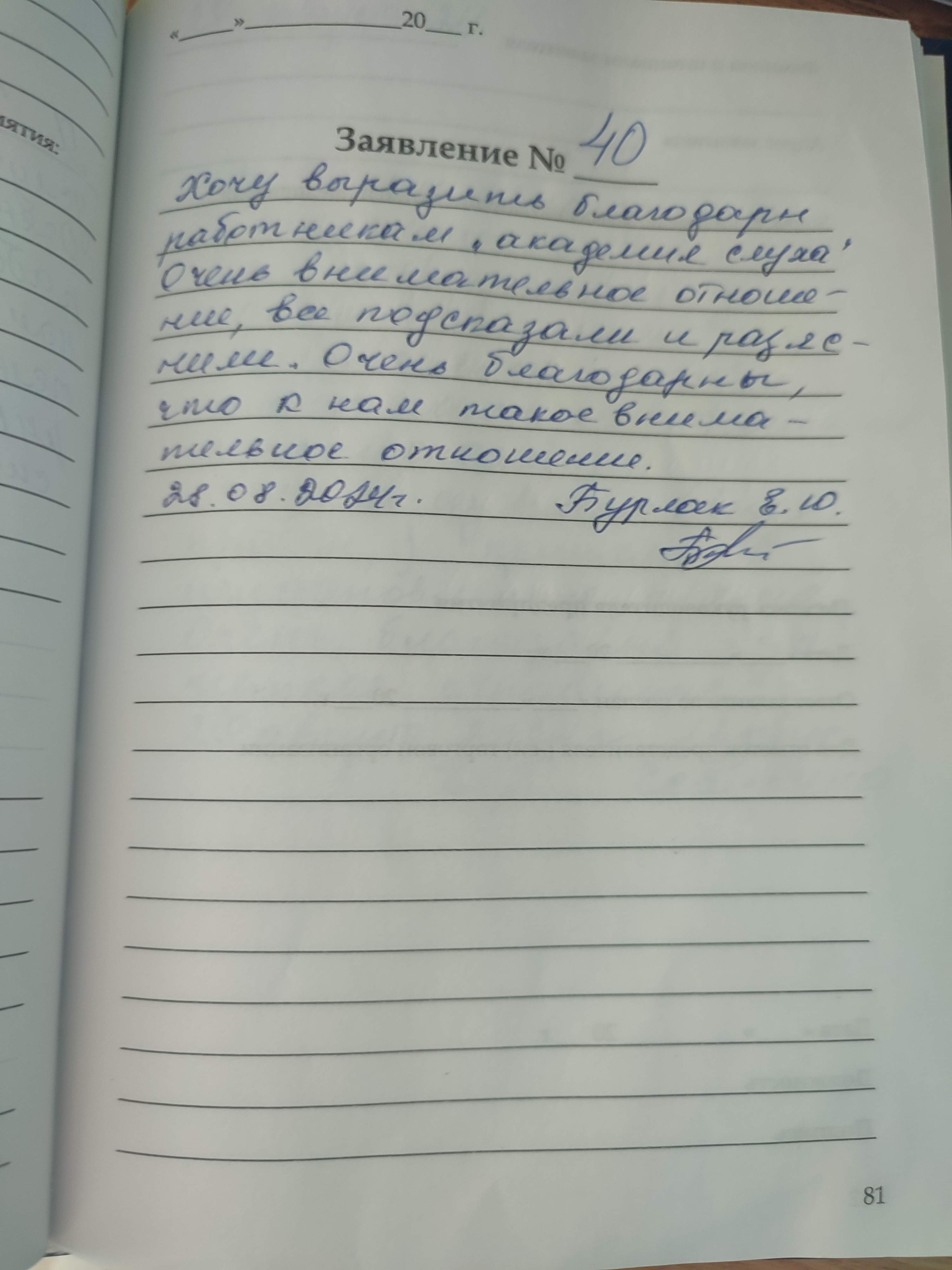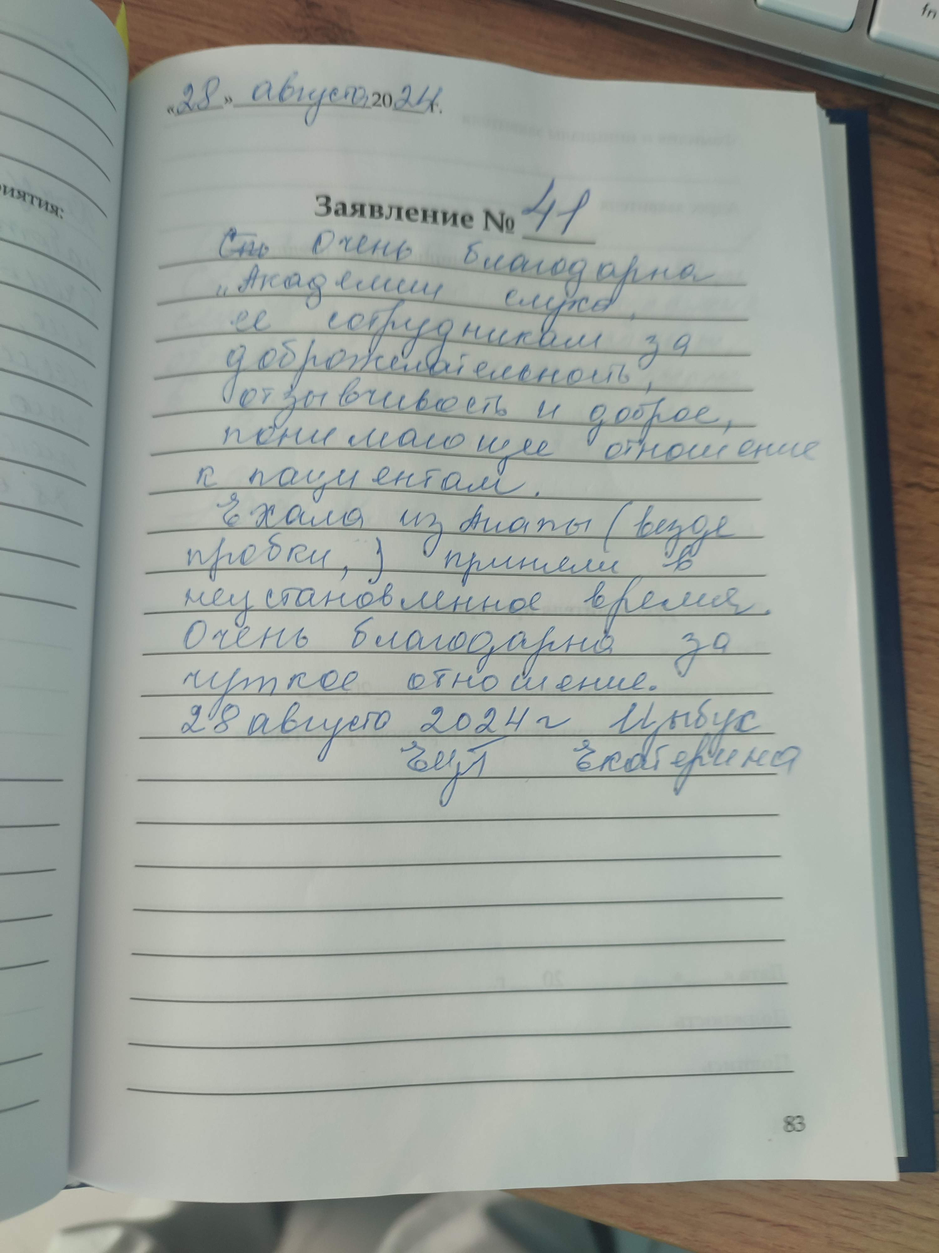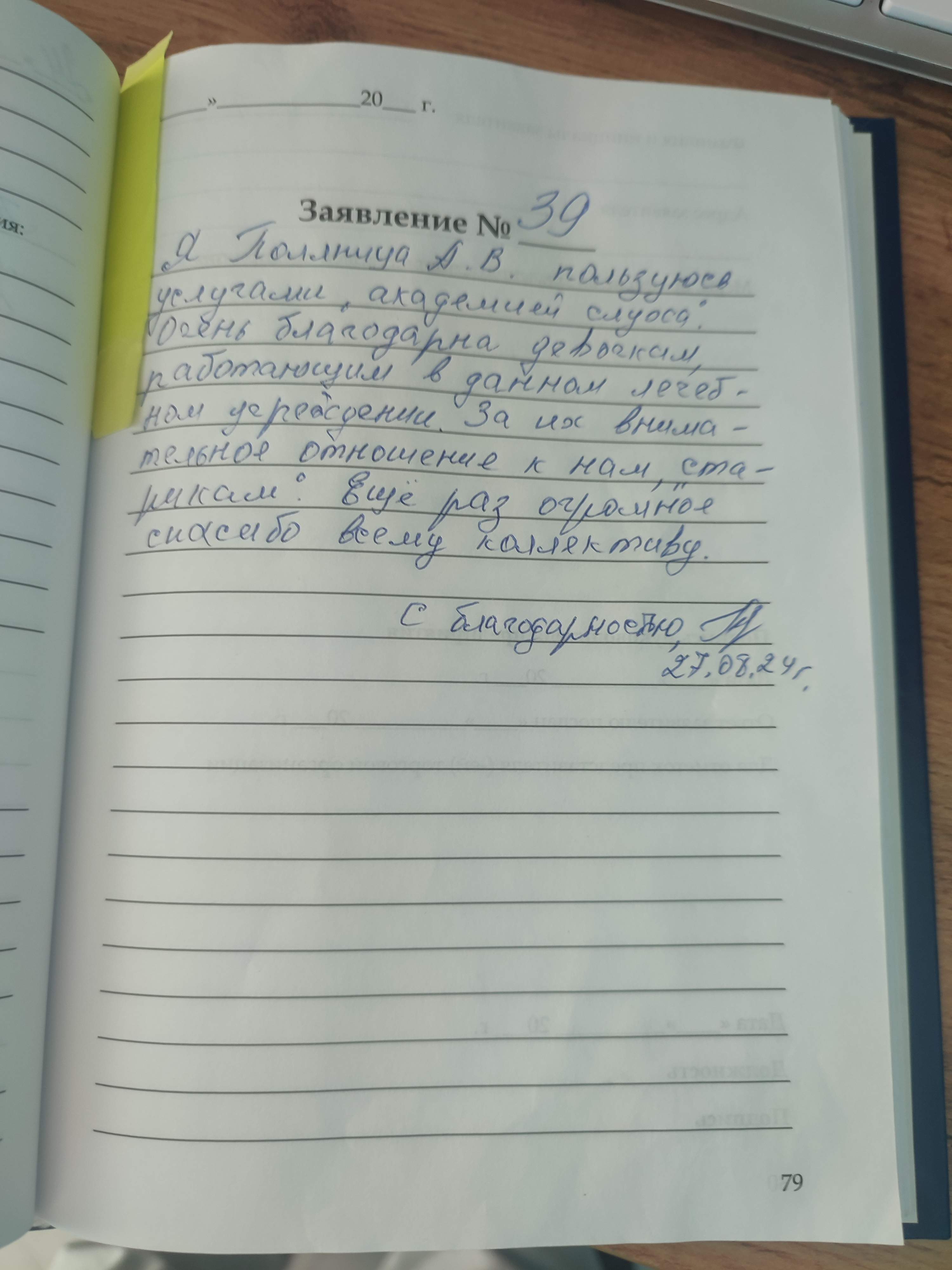 Очень благодарна " Академии Слуха", ее сотрудникам за отзывчивость и доброе, понимающее отношение к пациентам. Ехала из Анапы ( везде пробки), приняли в неустановленное время. Очень благодарна за чуткое отношение. 28 августа 2024г.