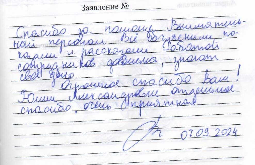 Спасибо за помощь. Внимательный персонал. Всё объяснили, показали и рассказали. Работой сотрудников довольны, знают своё дело.