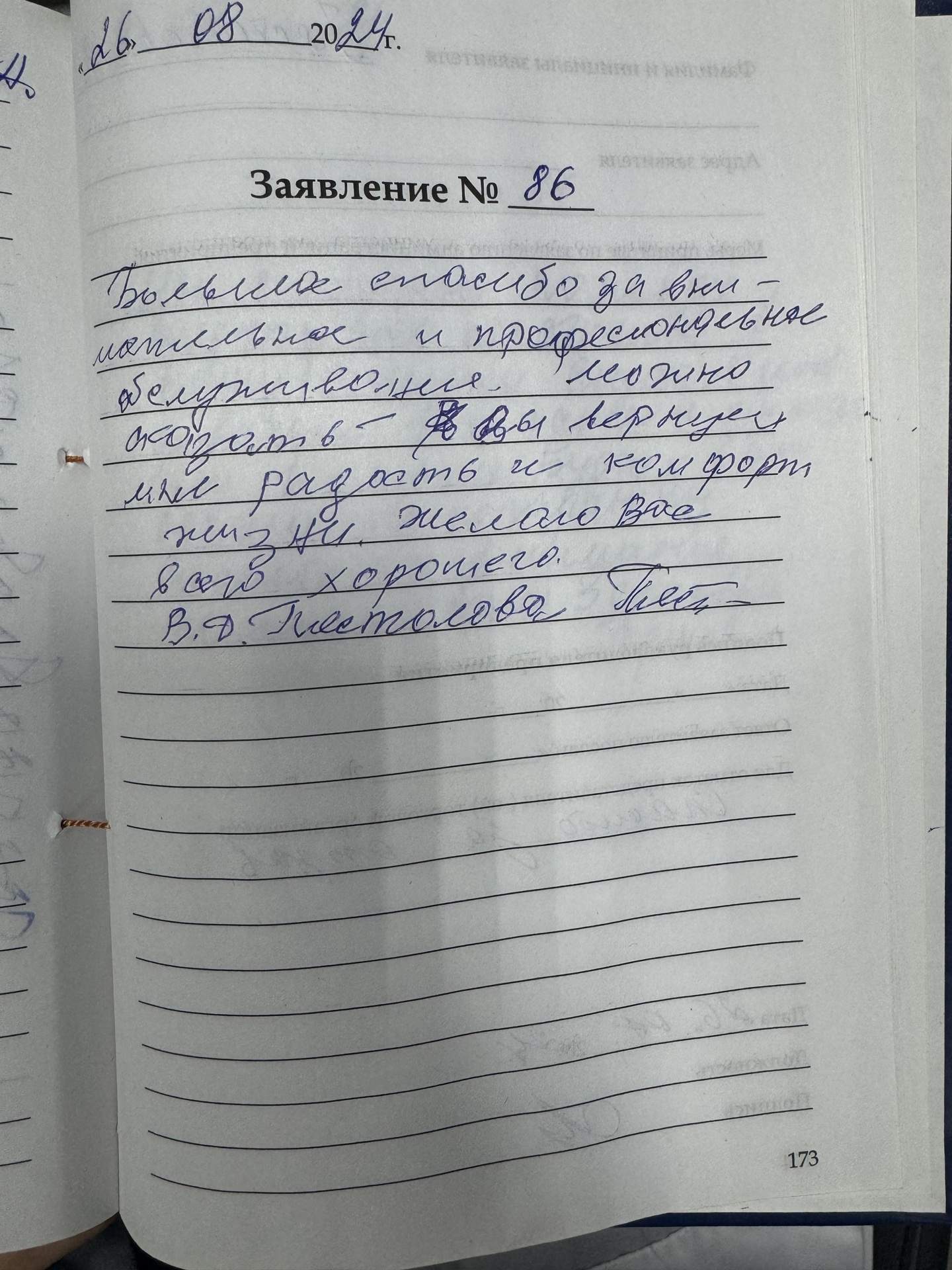 Большое спасибо за внимательное и профессиональное обслуживание. Можно сказать - Вы вернули мне радость и комфорт жизни. Желаю Вам всего хорошего.