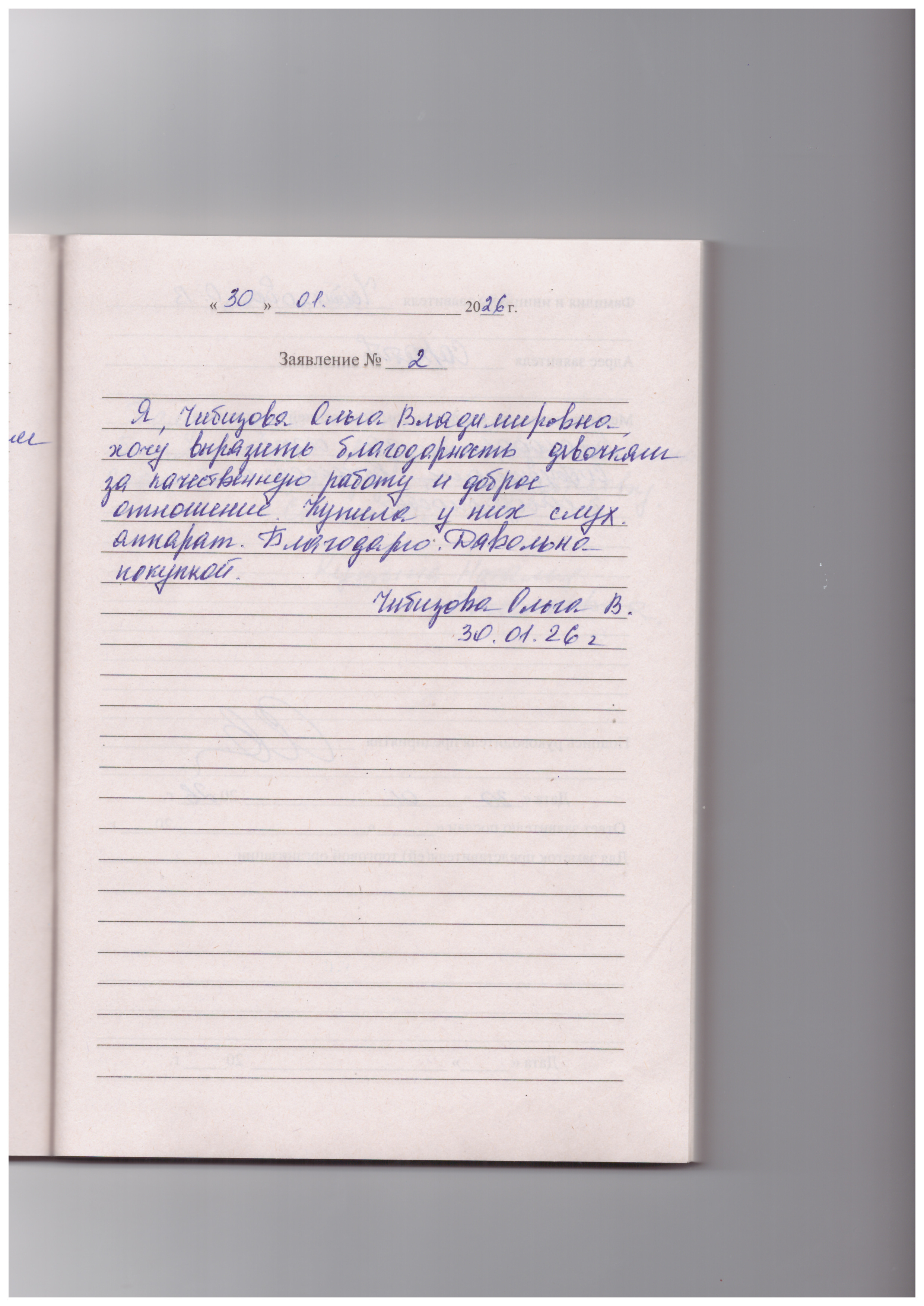 Я, Морозова Валентина Ивановна, получила аппарат. Специалисты мне его хорошо настроили и очень доброжелательно отнеслись ко мне. Спасибо.