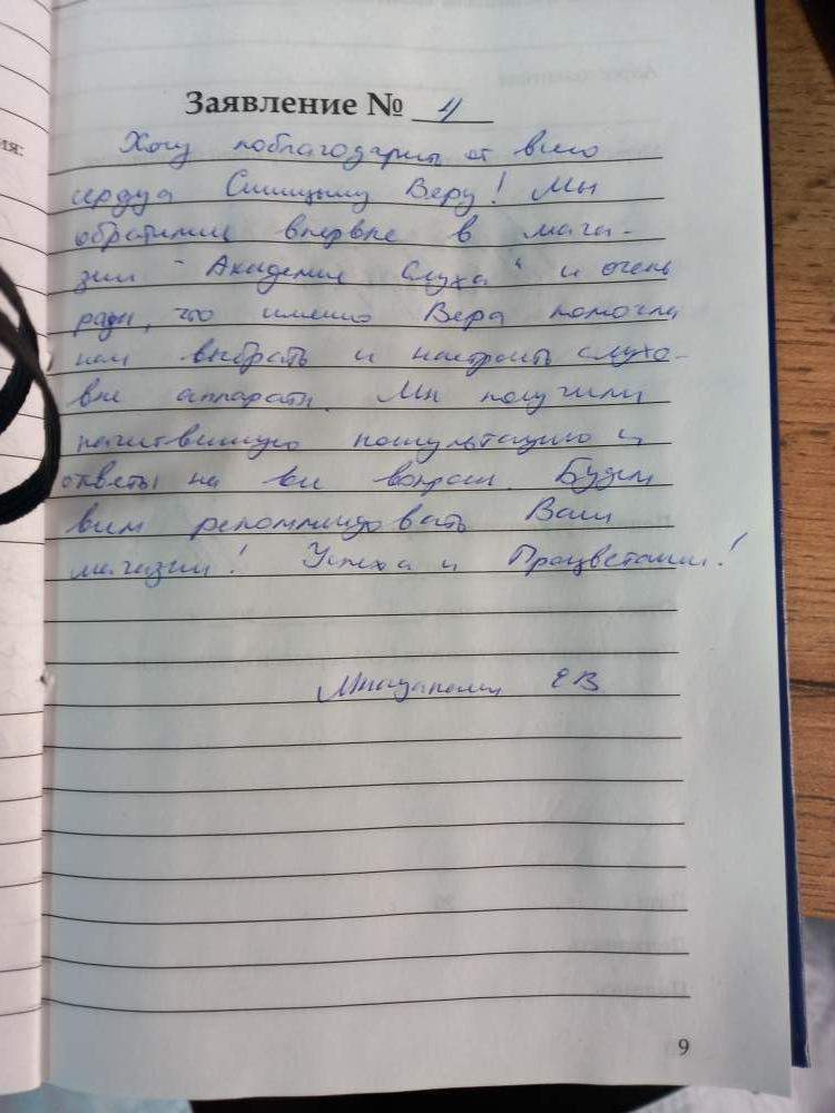Хочу поблагодарить от всего сердца Синицыну Веру! Мы обратились впервые в магазин Академия Слуха и очень рады что именно Вера помогла нам выбрать и настроить слуховые аппараты. Мы получили консультацию и ответы на все вопросы. Будем всем рекомендовать ваш магазин. Успехов и процветания.