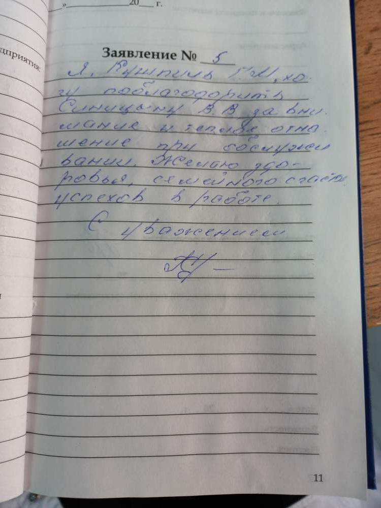 Я , Кушпиль Г.М., хочу поблагодарить Синицыну В.В. за внимание и теплое отношение при обслуживании. Желаю здоровья, семейного счастья, успехов в работе. С уважением.