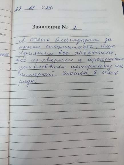 Я очень благодарна за прием специалиста, так приятно все объяснили, все проверили и прекрасно установили программу на аппарат. Спасибо. Я очень рада!