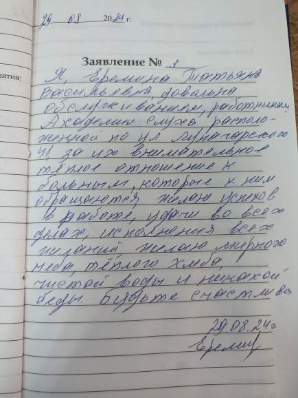 Я, Еремина Татьяна Васильевна, довольна обслуживанием работниками Академии Слуха, расположенной по улице Луначарского 41 , за их внимательное теплое отношение к больным, которые к ним обращаются. Желаю успехов в работе, исполнения всех желаний, желаю мирного неба, теплого хлеба, чистой воды и никакой беды. Будьте счастливы.