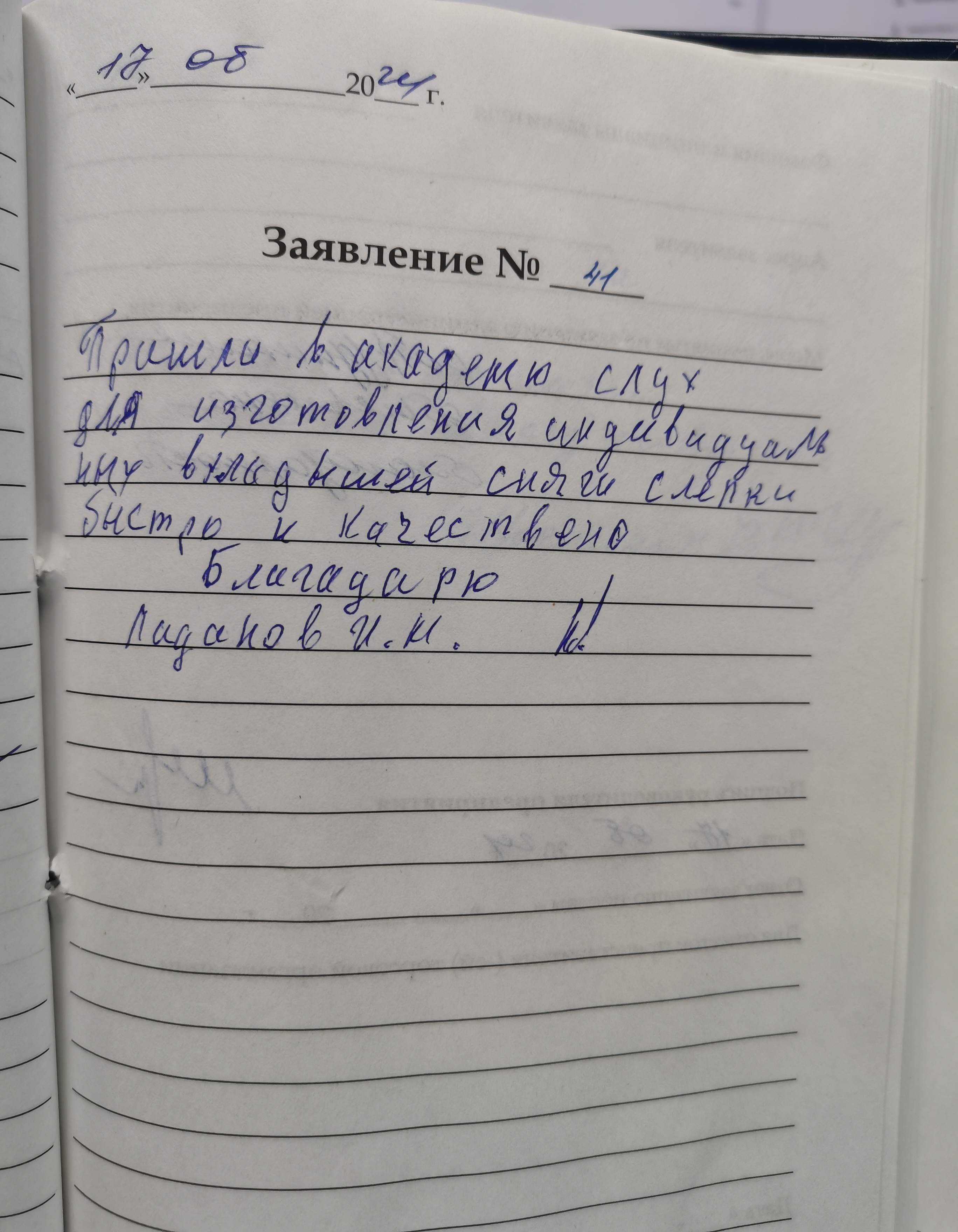 Пришли в «Академию Слуха» для изготовления индивидуальных вкладышей, сняли слепки быстро и качественно. Благодарю Ладанов И.М