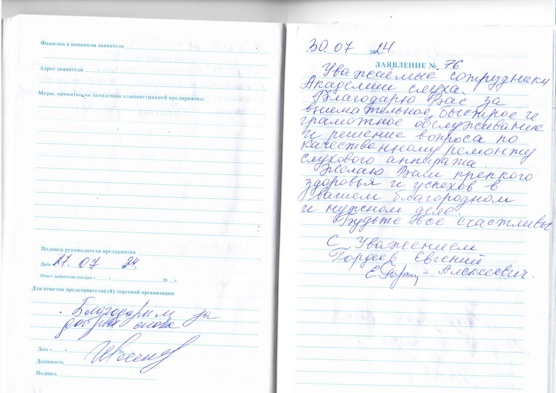 Уважаемые сотрудники Академии слуха. Благодарю Вас за внимательное, быстрое и грамотное обслуживание и решение вопроса по качественному ремонту слухового аппарата. Желаю Вам крепкого здоровья и успехов в вашем благородном и нужном деле. Будьте все счастливы. С уважением Гордеев Евгений Алексеевич.