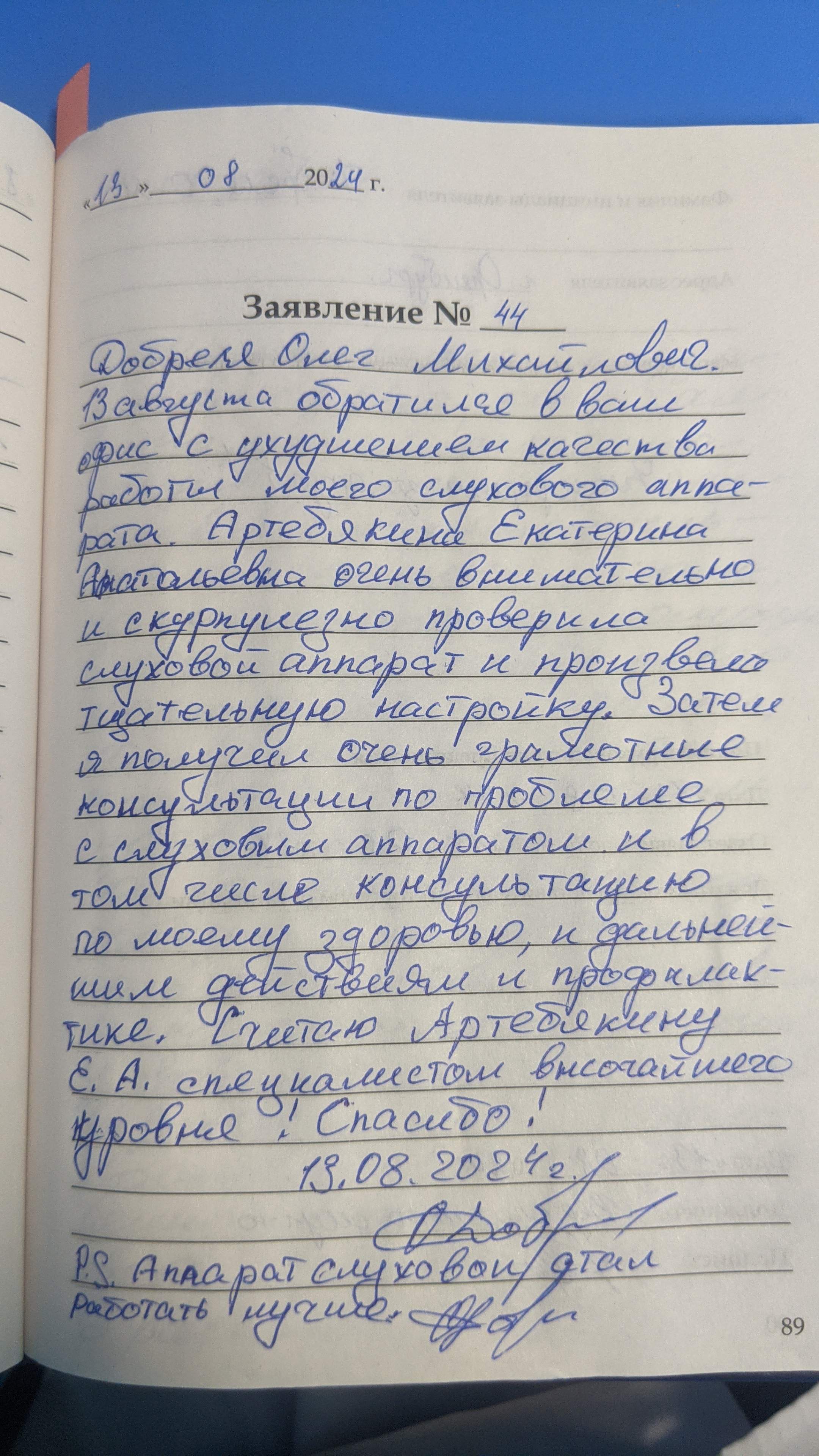 Добреля Олег Михайлович, 13 августа обратился в ваш офис с ухудшением качества работы моего слухового аппарата. Артебякина Екатерина Анатольевна очень внимательно и скрупулезно проверила слуховой аппарат и произвела тщательную настройку. Затем я получил очень грамотные консультации по проблеме с слуховым аппаратом и в том числе консультацию по моему здоровью и дальнейшим действиям и профилактике. Считаю Артебякину Е.А. специалистом высшего уровня! Спасибо!