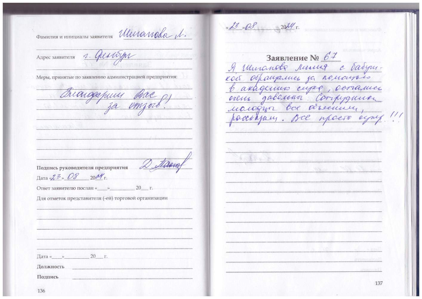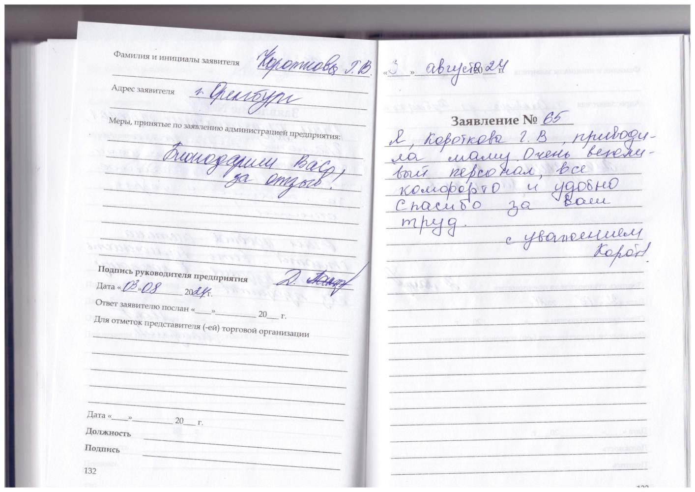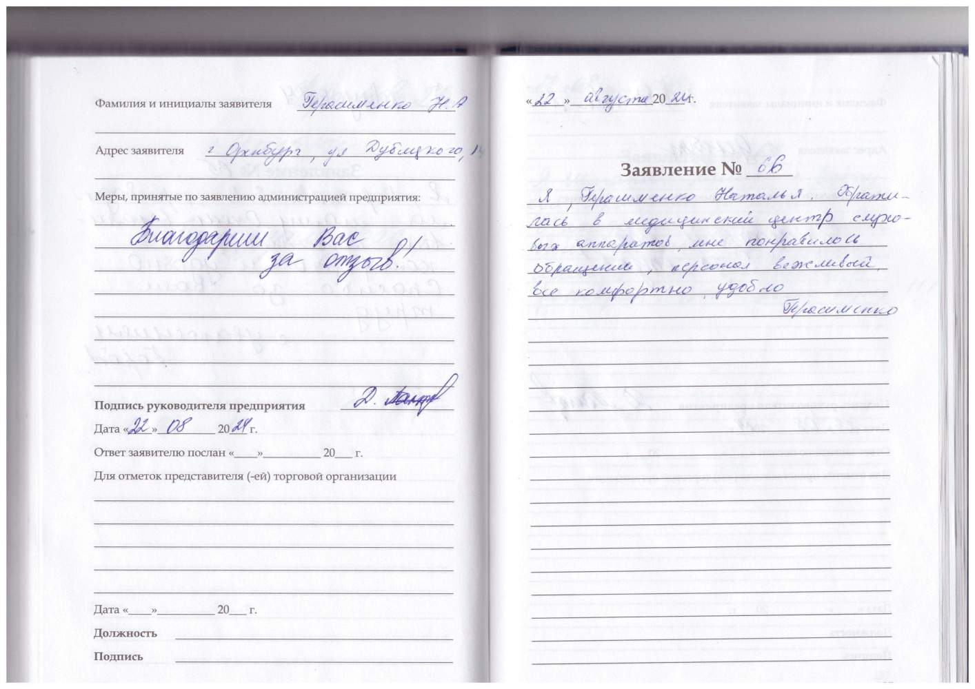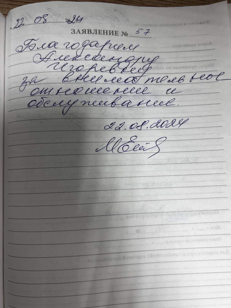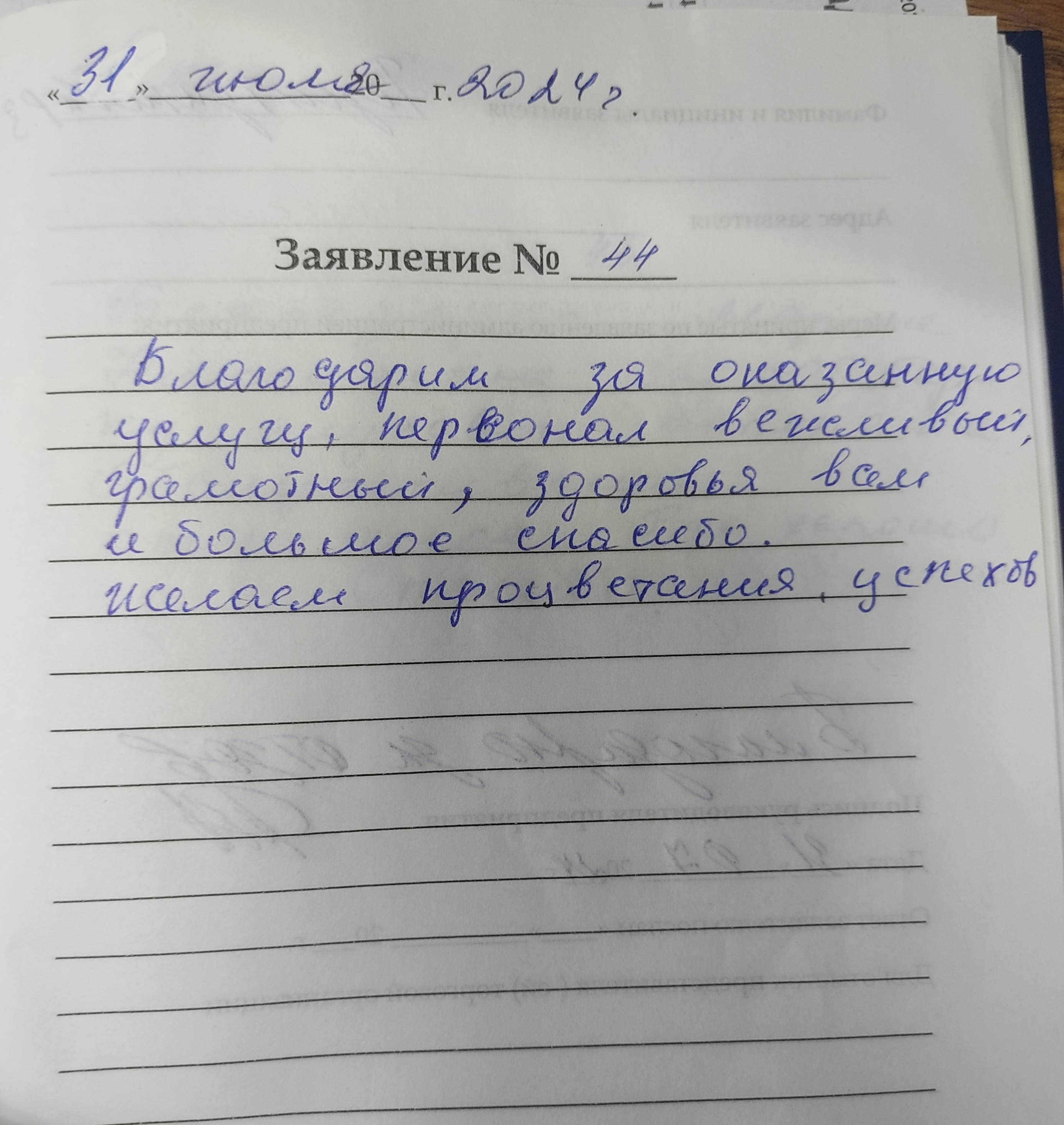 Благодарим за оказанную услугу, персонал вежливый грамотный, здоровья всем и большое спасибо. Желаем процветания, успехов.