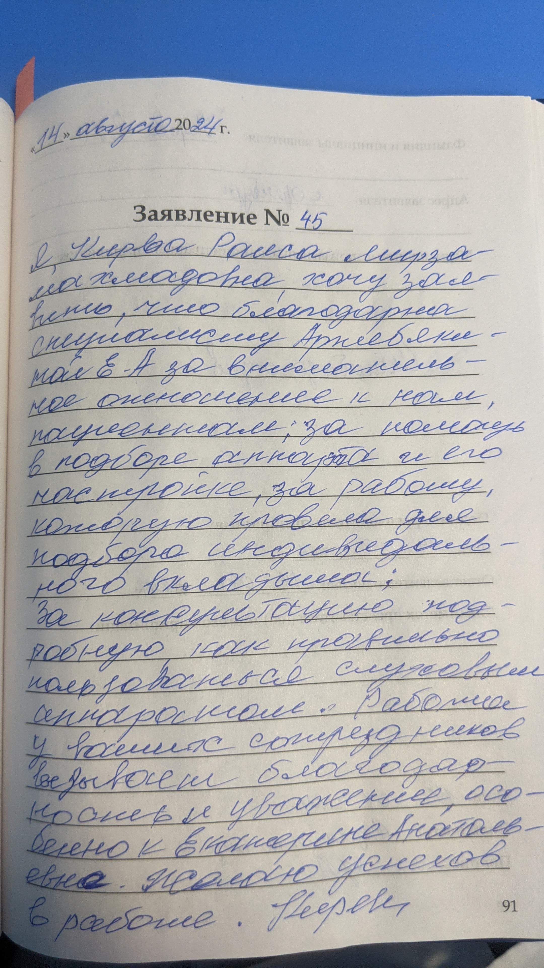 Я, Кирева Раиса Мирзамахмадовна, хочу заявить, что благодарна специалисту Артебякиной Е.А за внимательное отношение к нам , пациентам, за помощь в подборе аппарата и его настройке, за работу , которую провела подбора индивидуального вкладыша.
