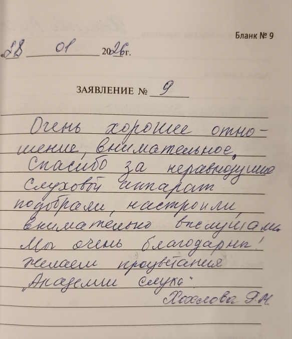 Очень хорошее отношение ,внимательное. Спасибо за неравнодушие. Слуховой аппарат подобрали, настроили, внимательно выслушали. Мы очень благодарны! Желаем процветания "Академии слуха"