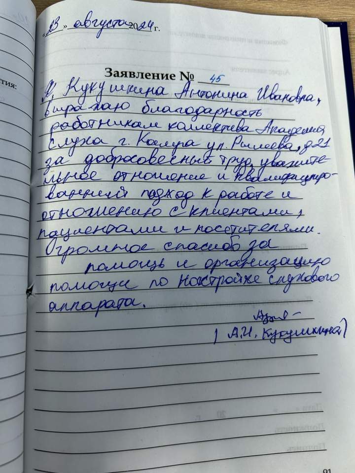 23.08.2024 Я Кукушкина Антонина Ивановна, выражаю благодарность работникам коллектива Академия слуха г. Калуга ул. Рылеева д.21 за добросовестный труд, уважительное отношение и квалифицированный подход к работе и отношению с клиентами, пациентами и посетителями. Огромное спасибо за помощь и организацию помощи по настройке слухового аппарата. А.И. Кукушкина