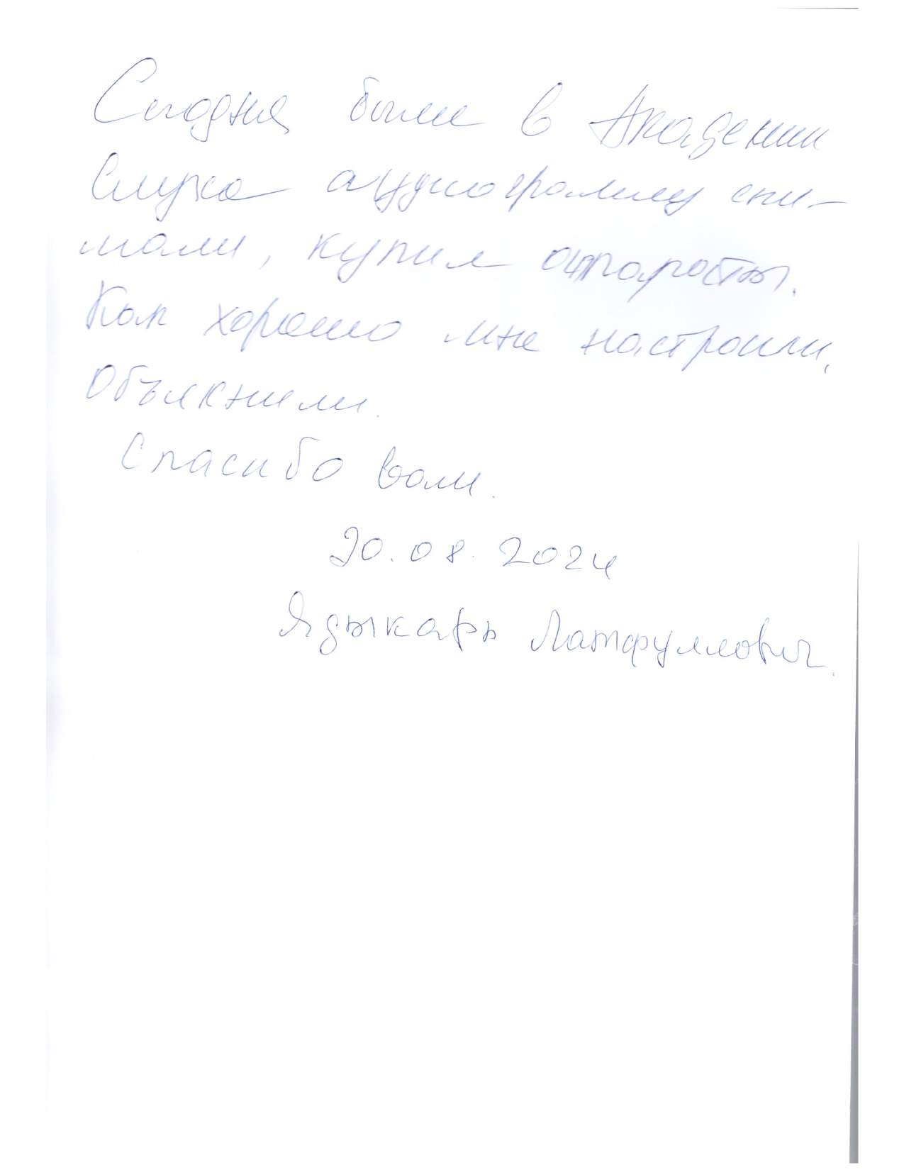 Я Мельникова Гульсина Шаиховна хочу сказать спасибо сотрудникам Академии слуха за хорошее отношение. Очень приветливые и вежливые сотрудники.