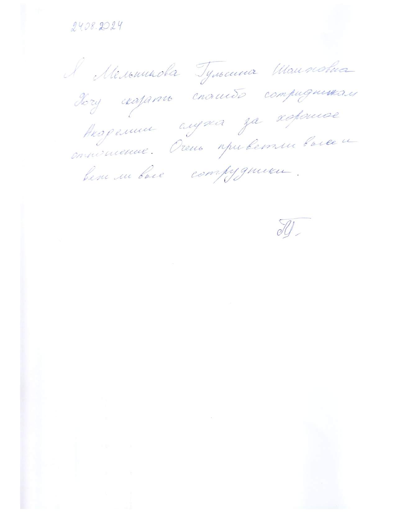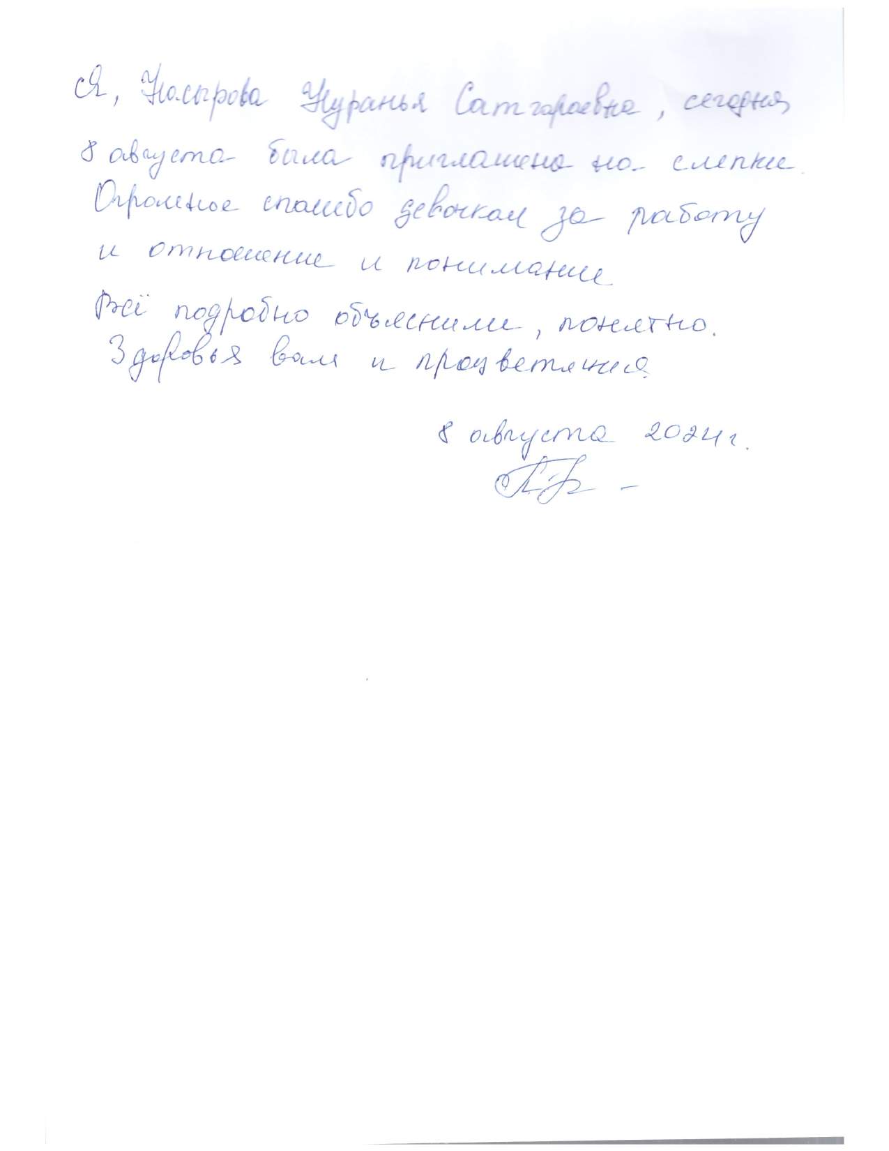 Я, Насырова Нуранья Сатгараевна, сегодня, 8 августа была приглашена на слепки. Огромное спасибо девочкам за работу и отношение, и понимание. Все подробно объяснили, понятно. Здоровья Вам и процветания
