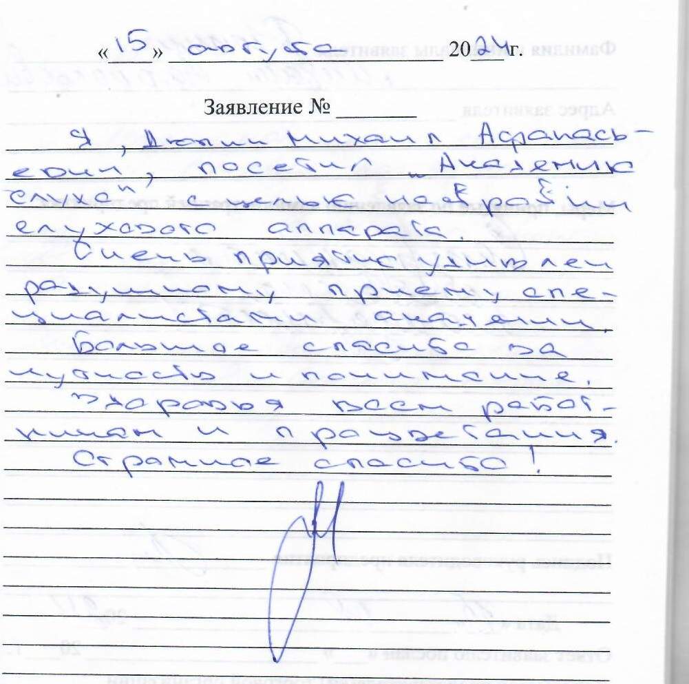 Я, Дюпин Михаил Афанасьевич, посетил «Академию слуха» с целью настройки слухового аппарата. Очень приятно удивлен радушному приему специалистами Академии. Большое спасибо за чуткость и понимание. Здоровья всем работникам и процветания. Огромное спасибо!