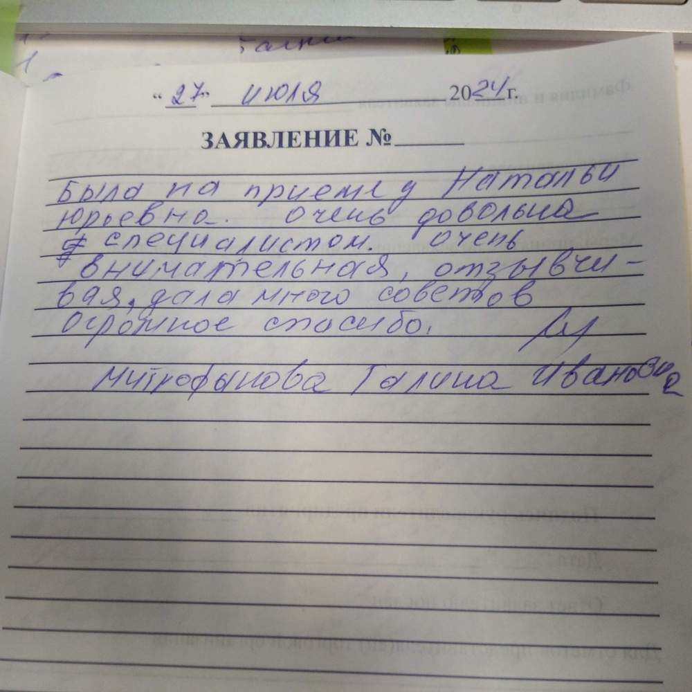 Была на приеме у Натальи Юрьевны. Очень довольна специалистом, очень внимательная, отзывчивая, дала много советов. Огромное спасибо.