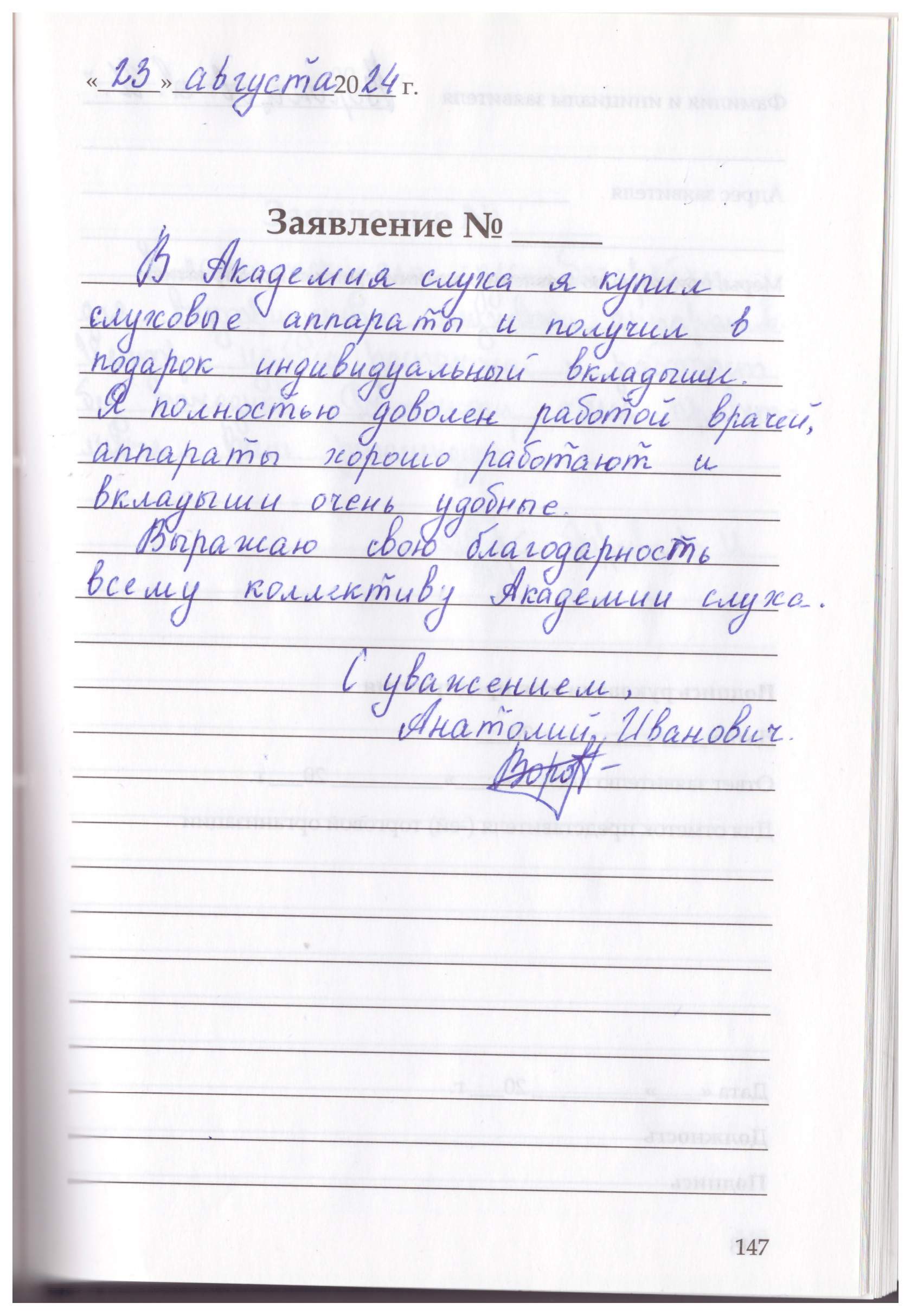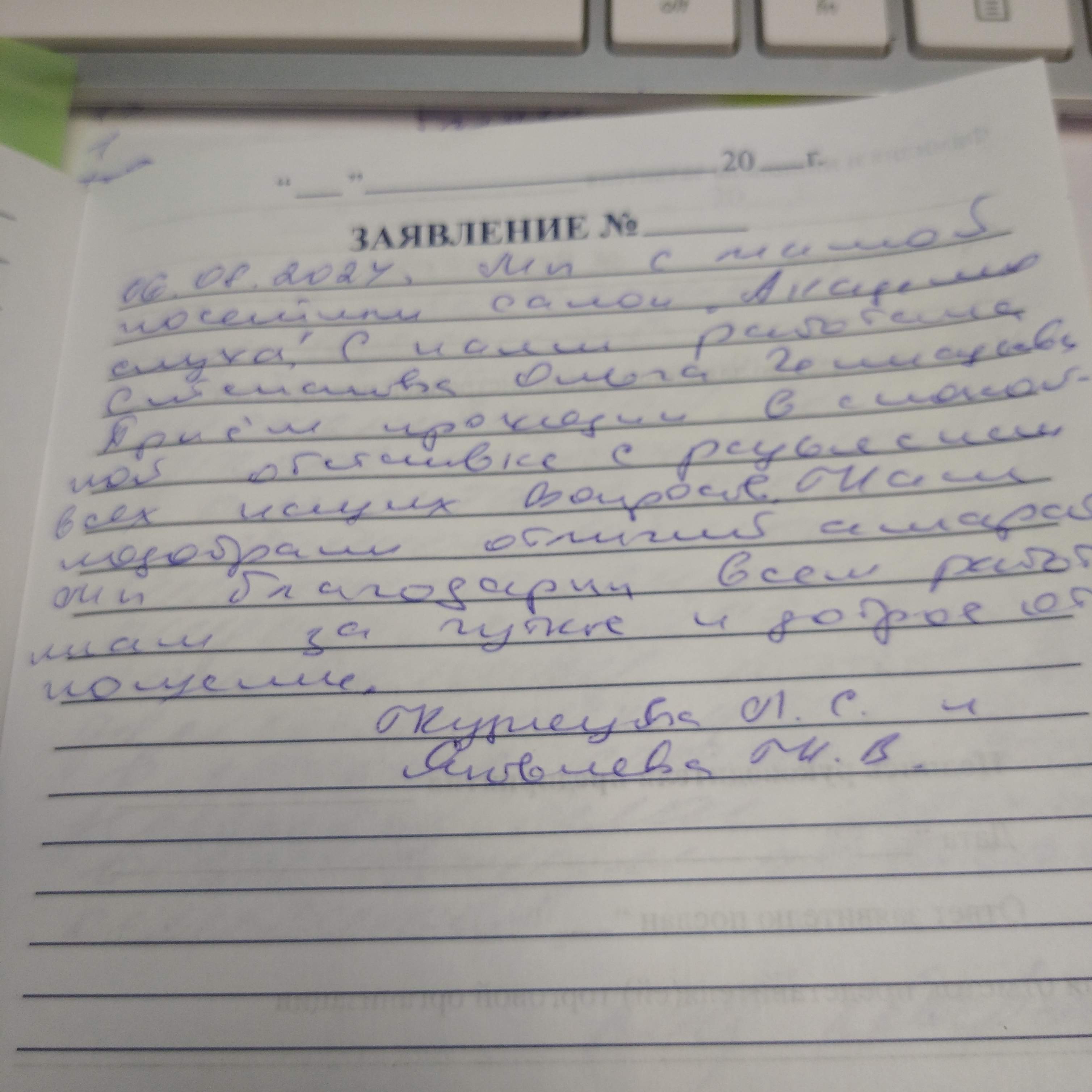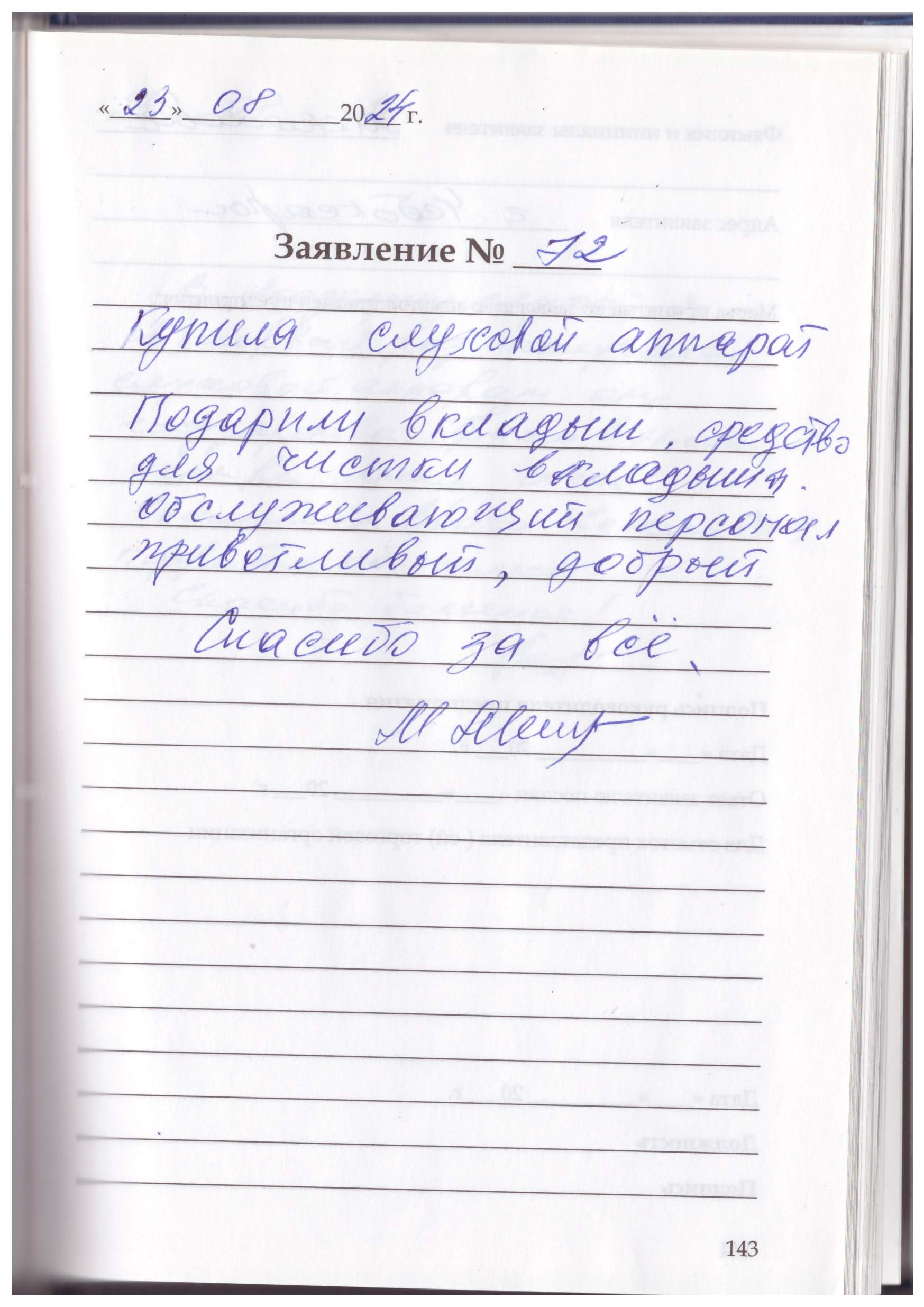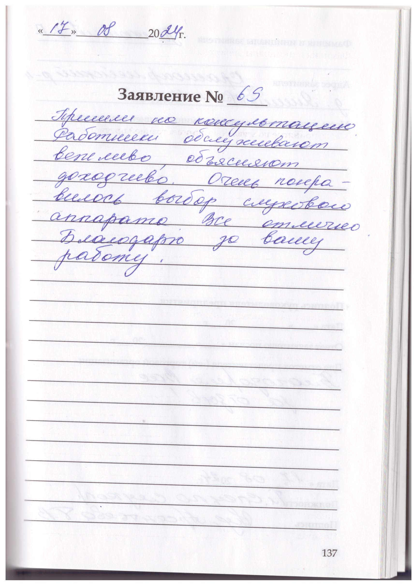 06.08.2024 мы с мамой посетили салон "Академии слуха". С нами работала Степанова Ольга Геннадьевна.Прием проходил в спокойной обстановке с разъяснением всех наших вопросов. Нам подобрали отличный аппарат. Мы благодарны всем работникам за чуткое и доброе отношение.