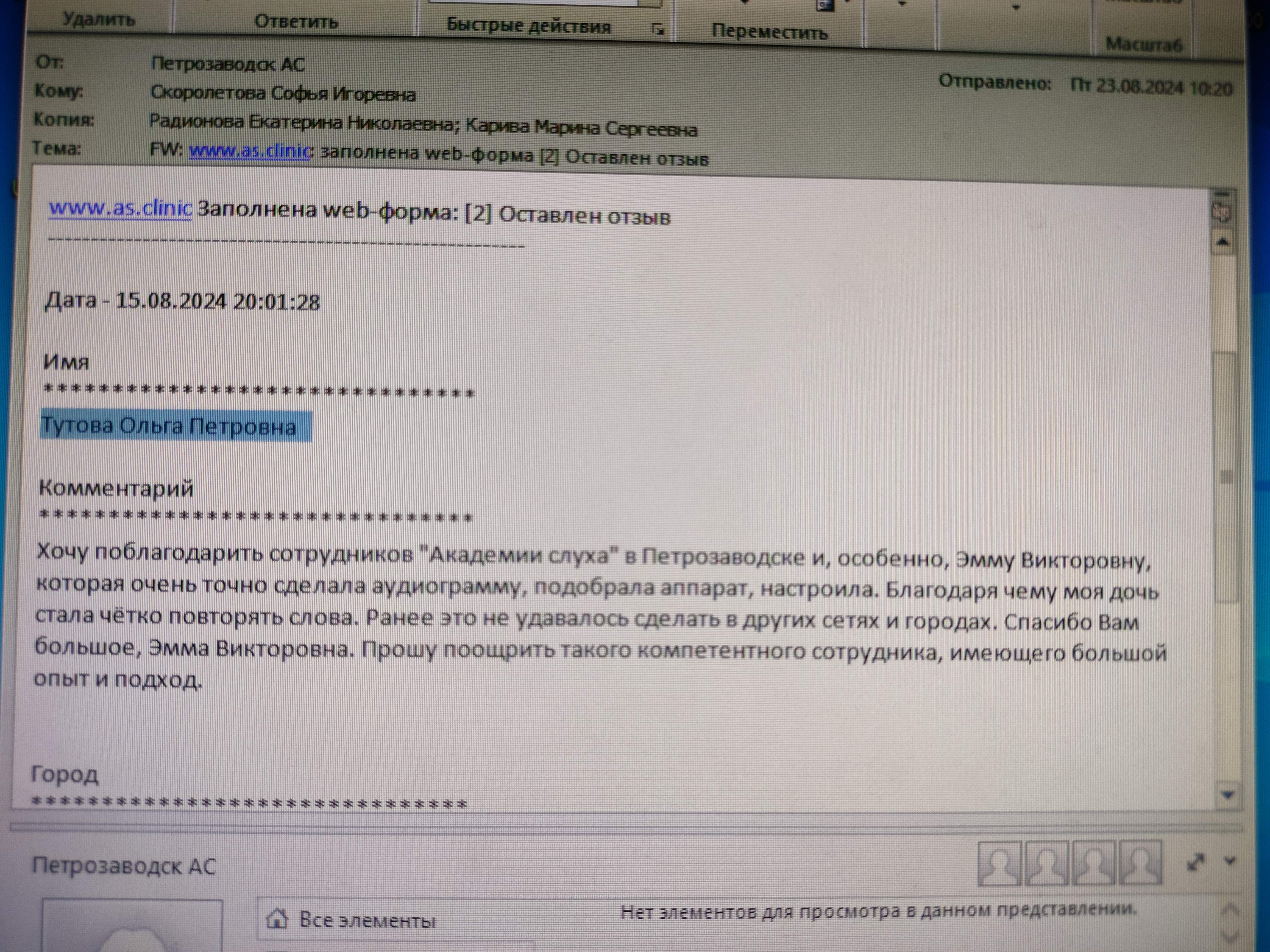 Хочу поблагодарить сотрудников "Академии слуха" в Петрозаводске и, особенно, Эмму Викторовну, которая очень точно сделала аудиограмму, подобрала аппарат, настроила. Благодаря чему моя дочь стала чётко повторять слова. Ранее это не удавалось сделать в других сетях и городах. Спасибо Вам большое, Эмма Викторовна. Прошу поощрить такого компетентного сотрудника, имеющего большой опыт и подход.
