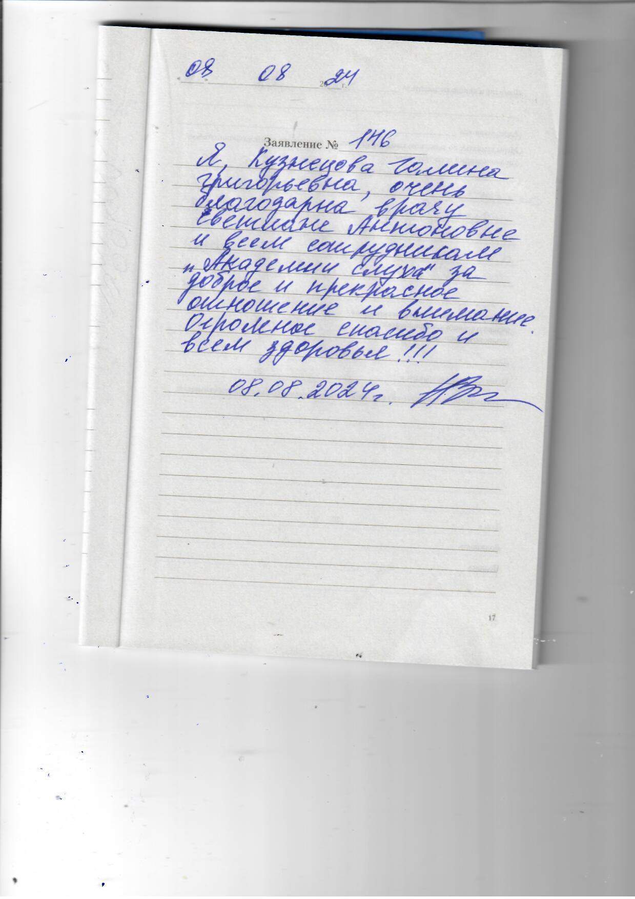 Я, Кузнецова Галина Григорьевна, очень благодарна врачу Светлане Антоновне и всем сотрудникам " Академии Слуха" за доброе и прекрасное отношение и внимание. Огромное спасибо и всем здоровья!!!