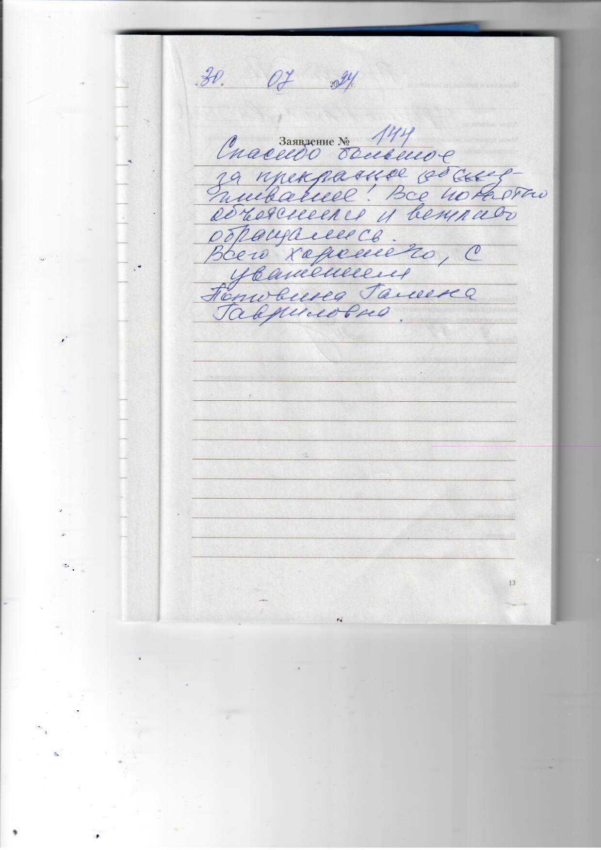 Спасибо большое за прекрасное обслуживание! Все понятно объяснили и вежливо обращались. Всего хорошего, с уважением Потовина Галина Гавриловна!