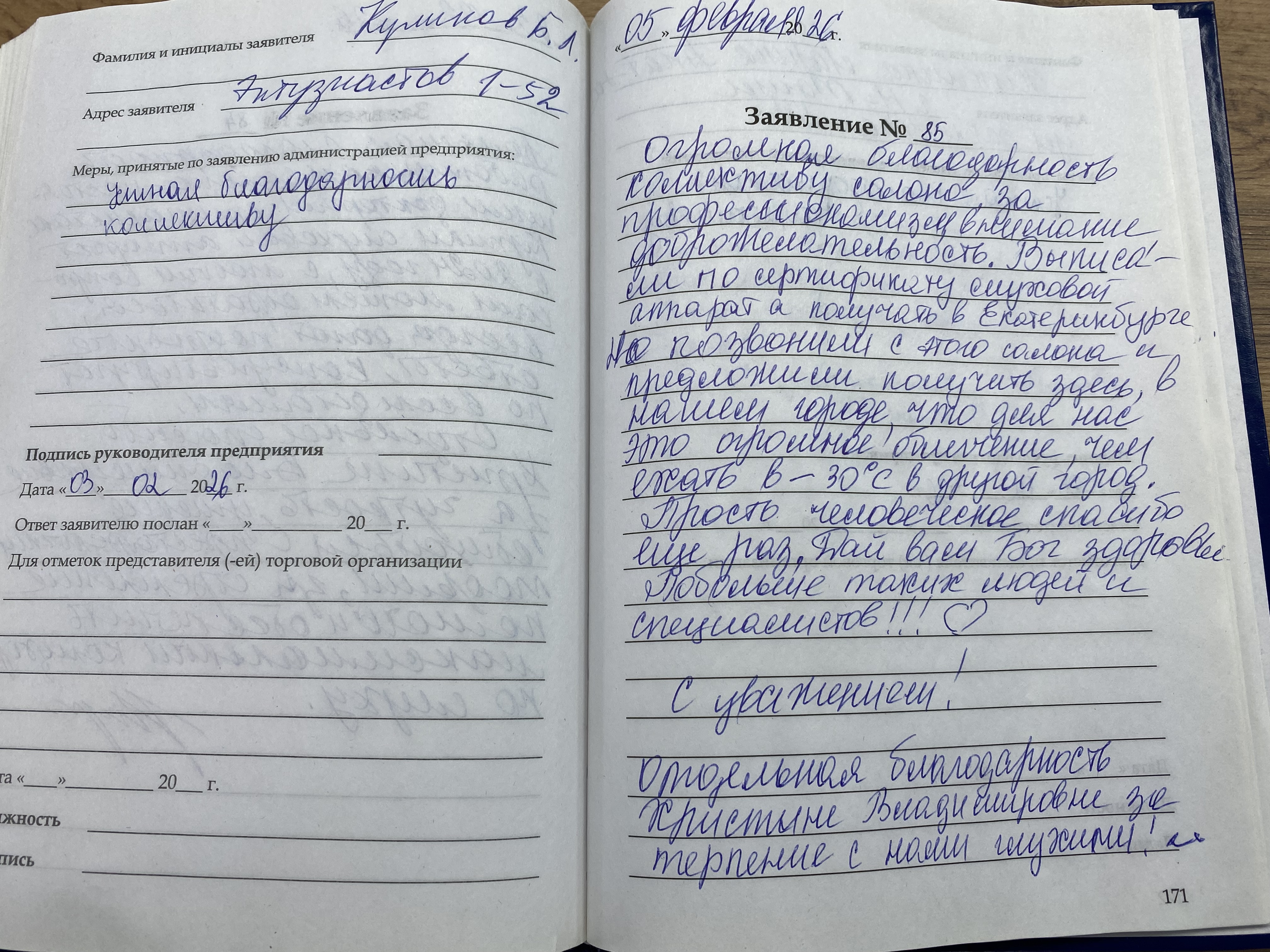 Огромная благодарность коллективу салона, за профессионализм, внимание, доброжелательность. Выписали по сертификату слуховой аппарат, а получать в Екатеринбурге. Но позвонили с этого салона и предложили получить здесь, в нашем городе, что для нас это огромное облегчение, чем ехать в -30 в другой город. Просто человеческое спасибо ещё раз. Дай вам Бог здоровья. Побольше таких людей и специалистов. С уважением! Отдельная благодарность Христине Владимировне за терпение с нами глухими!