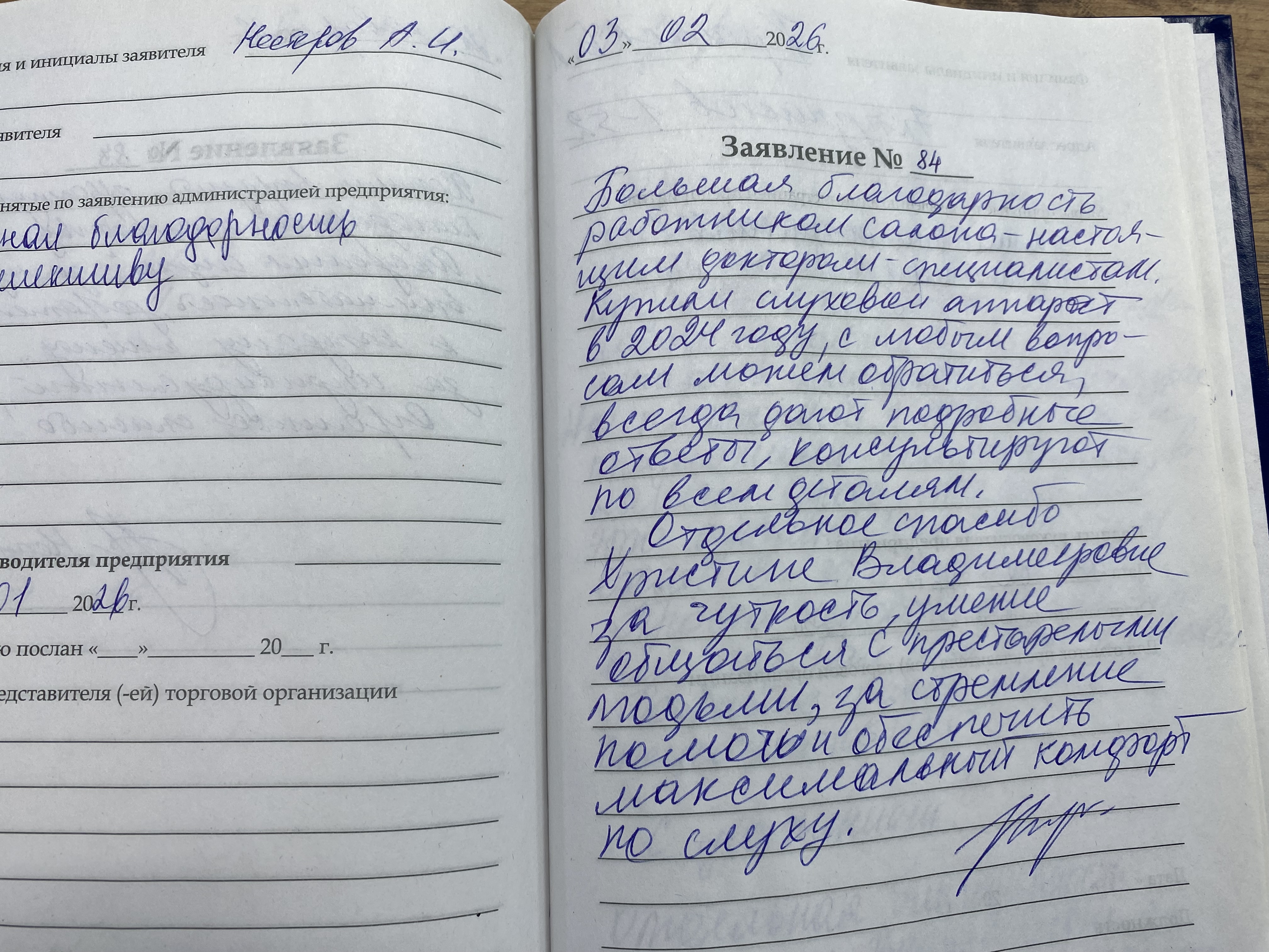 Большая благодарность работникам салона - настоящим докторам - специалистам. Купили слуховой аппарат в 2024 году, с любым вопросом может обратиться, всегда дают подробные ответы, консультируют по всем деталям. Отдельное Спасибо Христине Владимировне за чуткость, умение общаться с престарелыми людьми, за стремление помочь и обеспечить максимальный комфорт по слуху.