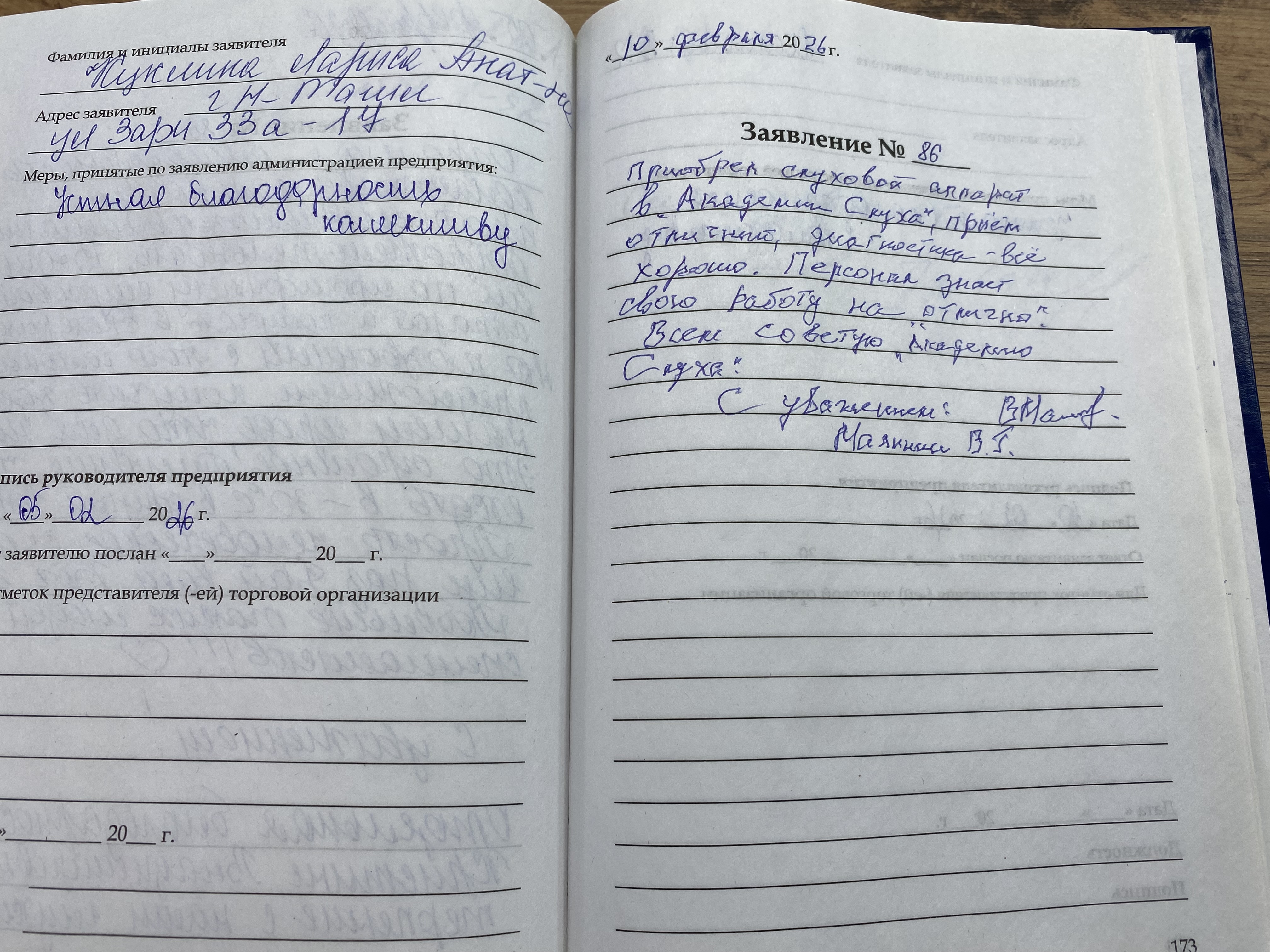 Хотим выразить огромную благодарность коллективу "Академия слуха" за чуткость, внимательность, доброжелательность к каждому клиенту, за индивидуальный подход. Огромное спасибо!