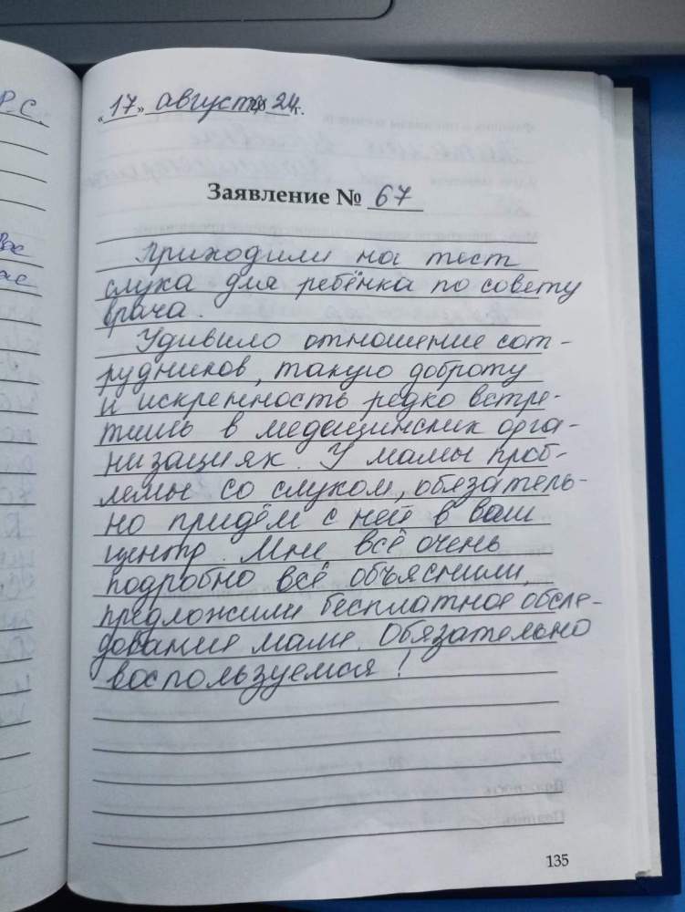 Удивило отношение сотрудников, такую доброту и искренность редко встретишь в медицинских организациях. У мамы проблемы со слухом, обязательно придём с ней в ваш центр. Мне всё очень подробно объяснили, предложили бесплатное обследование маме. Обязательно воспользуемся!