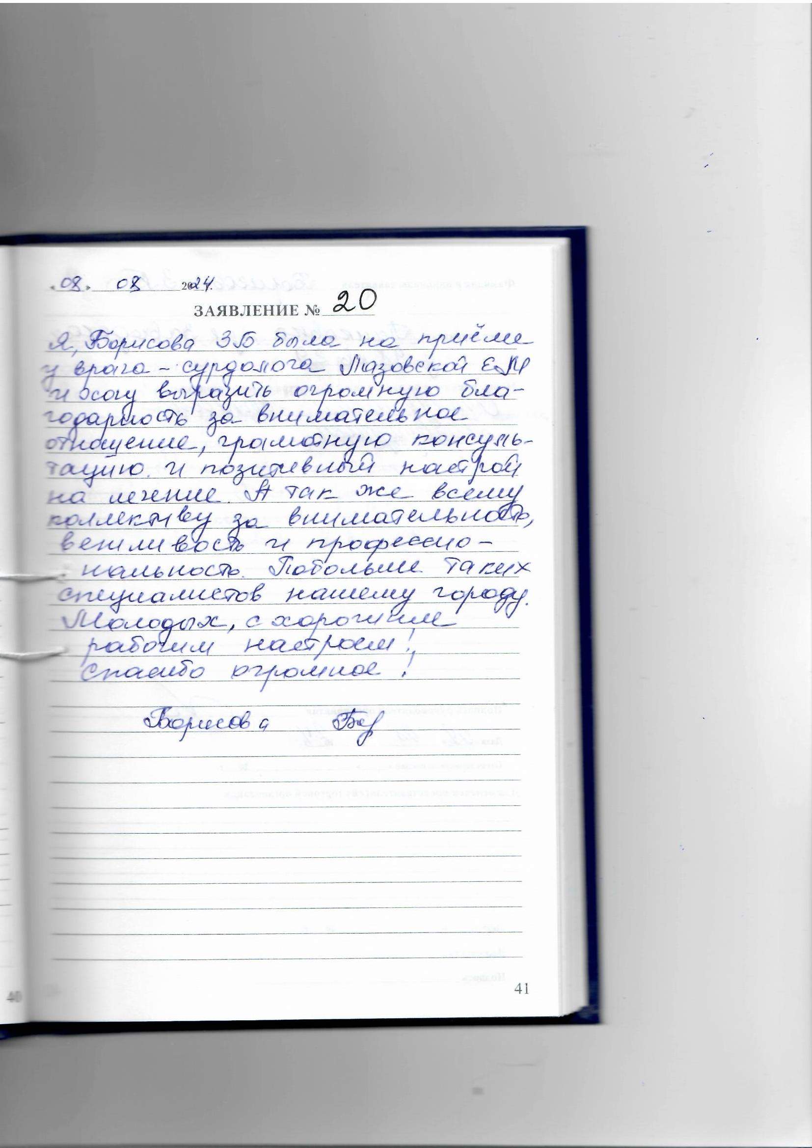 Я, Борисова З.Б. была приёме у врача-сурдолога Лазовской Е.М. т хочу выразить огромную благодарность за внимательное отношение, грамотную консультацию и позитивный настрой на лечение. А так же всему коллективу за внимательность, вежливость и профессиональность. Побольше таких специалистов нашему городу. Молодых, с хорошим рабочим настроем!