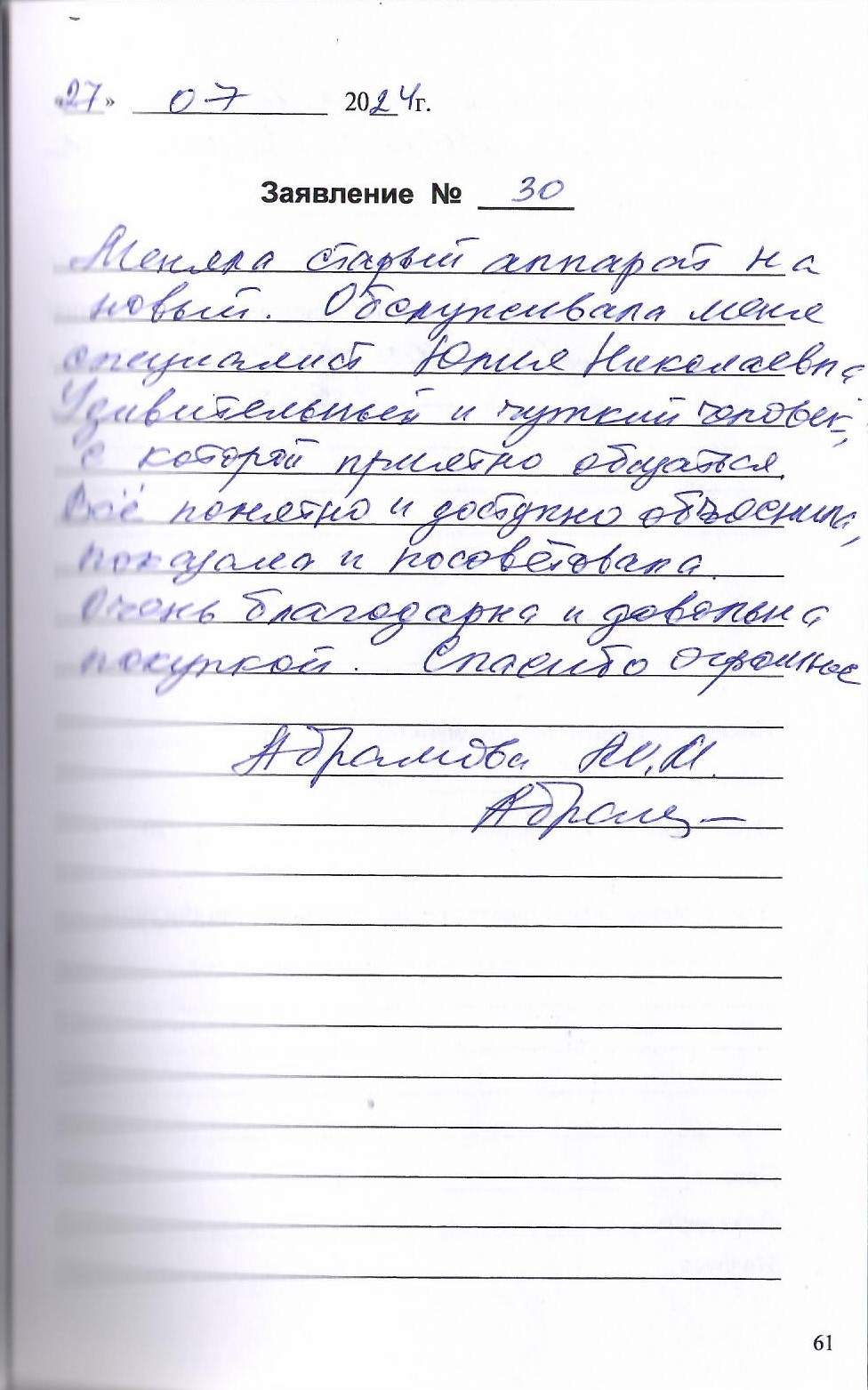 Меняла старый аппарат на новый. Обслуживала меня специалист Юлия Николаевна. Удивительный и чуткий человек, с которым приятно общаться. Все понятно и доступно объяснила, показала и посоветовала. Очень благодарна и довольна покупкой. Спасибо огромное.