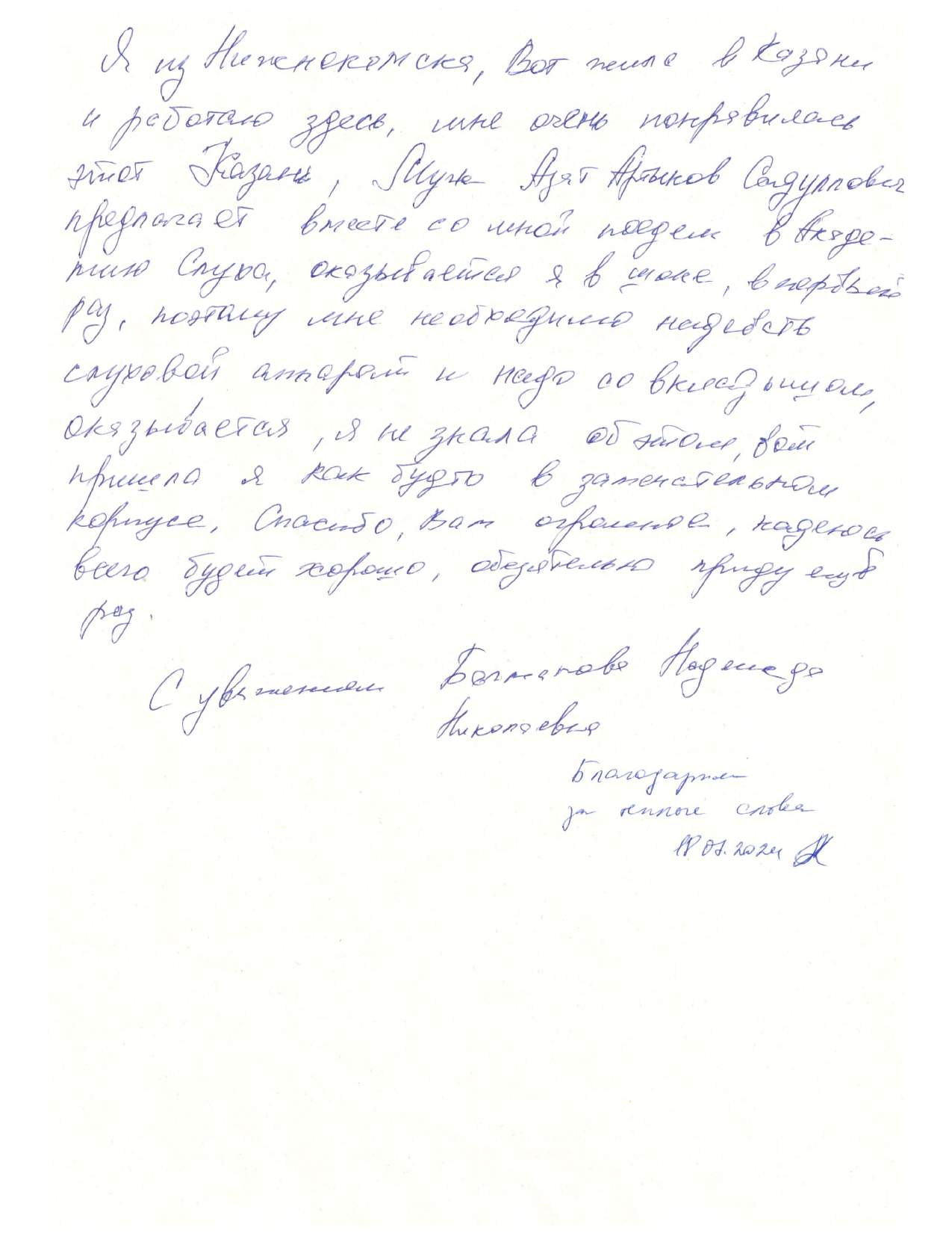 Я из Нижнекамска, Вот жила в Казани и работаю здесь, мне очень понравилось этой Казани. Муж Азат Артыков Садуллович предлагает вместе со мной поедем в Академию Слуха, оказывается я в шоке, в первый раз, поэтому мне необходимо надевать слуховые аппараты и надо со вкладышом, оказывается, я не знала об этом, вот пришла я как будто в замечательном корпусе. Спасибо, Вам огромное, надеюсь всего будет хорошо, обязательно приду еще раз.