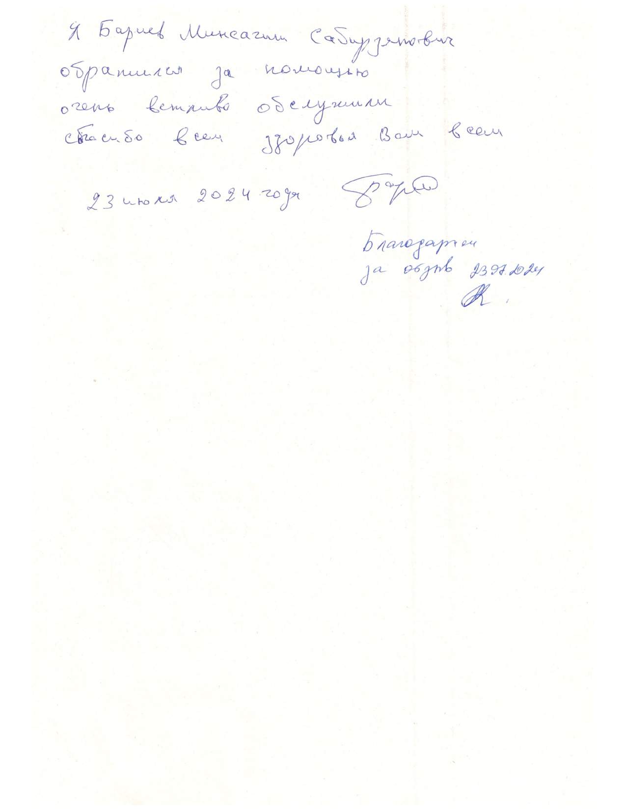 Я Бариев Минсагим Сабирзянович, обратился за помощью очень вежливо обслужили. Спасибо всем, здоровья Вам всем