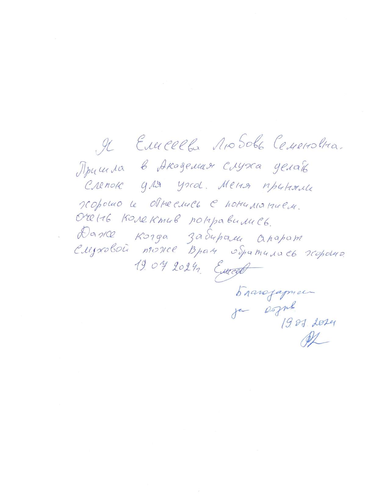 Я Елисеева Любовь Семеновна. Пришла в Академия слуха делать слепок для уха. Меня приняли хорошо и отнеслись с пониманием. очень коллектив понравились. Даже когда забирали аппарат слуховой тоже врач обратилась хорошо