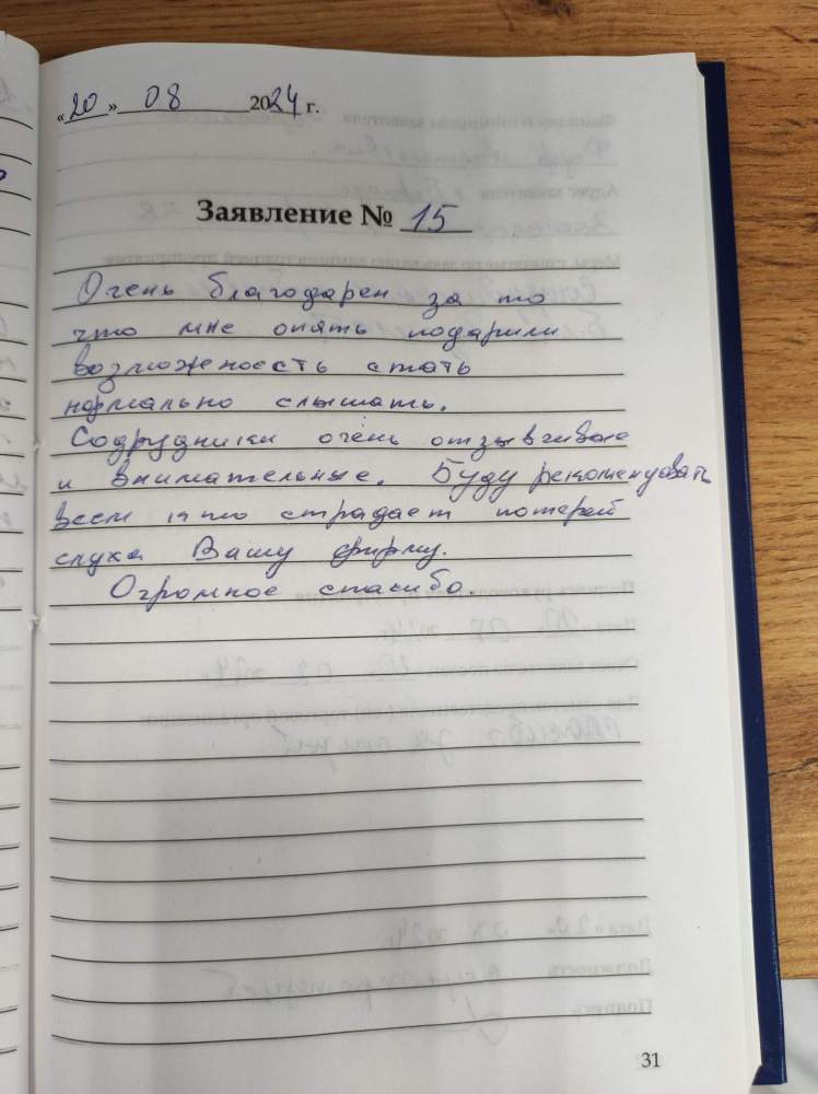 Очень благодарен зато что мне подарили возможность стать нормально слышать. Сотрудники очень отзывчивые и внимательные. Буду рекомендовать всем кто страдает потерей слуха Вашу фирму. Огромное спасибо.