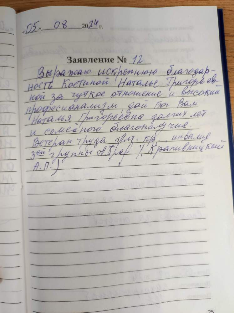 Выражаю искреннюю благодарность Костиной Наталье Григорьевны за чуткое отношение и высокий профессионализм, дай бог вам Наталья Григорьевна долгих лет и семейного благополучия. Ветеран труда Алт. кр. инвалид 3 группы Крапивницкий А.П.)