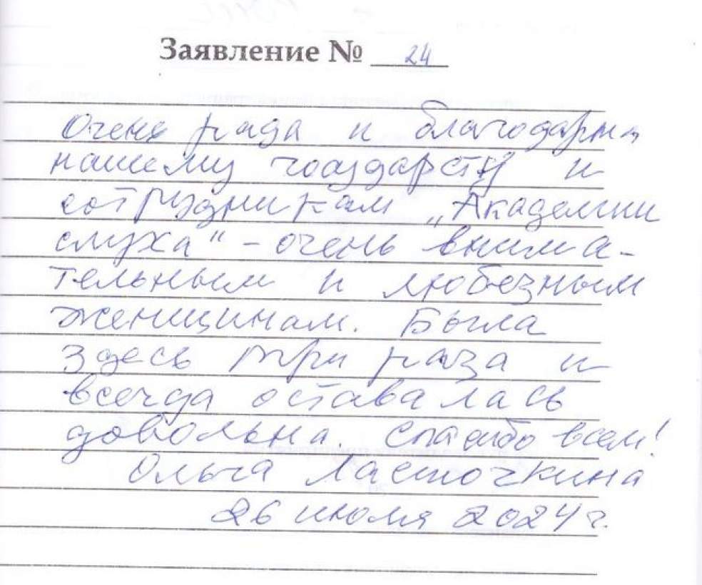 Очень рада и благодарна нашему государству и сотрудникам "Академии Слуха" - очень внимательным и любезным женщинам. Была здесь три раза и всегда оставалась довольна. Спасибо всем!