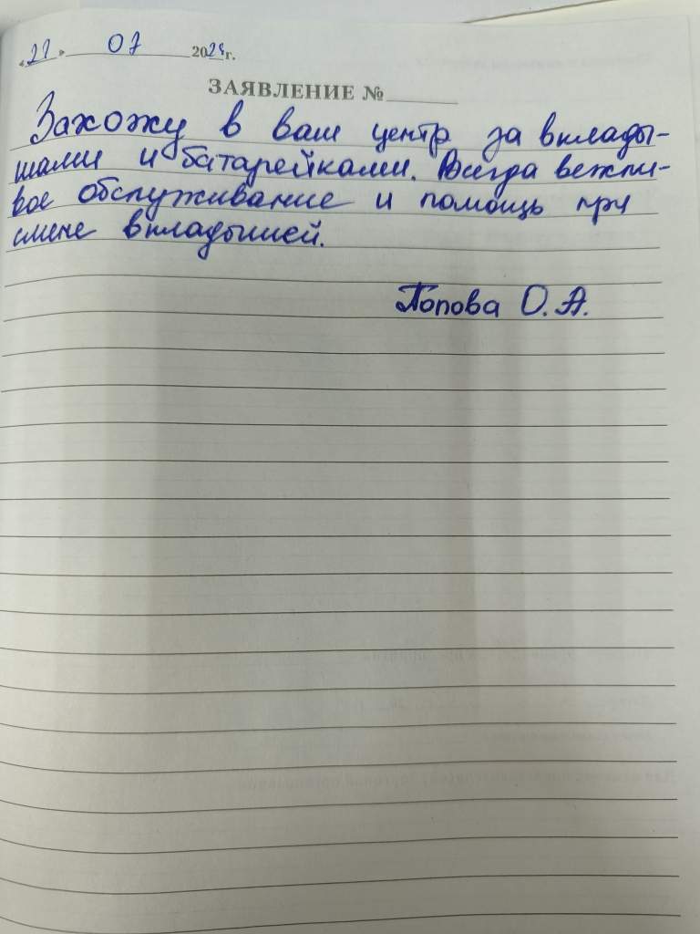 Захожу в ваш центр за вкладышами и батарейками. Всегда вежливое обслуживание и помощь при смене вкладышей