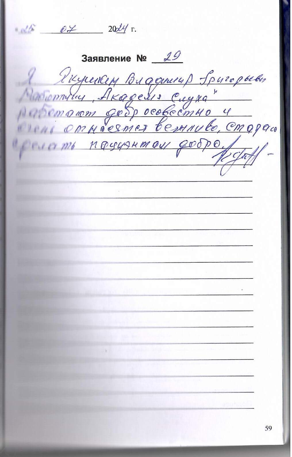 Я, Якушкин Владимир Григорьевич. Работники "Академия слуха" работают добросовестно и очень относятся вежливо, стараются сделать пациентам добро.