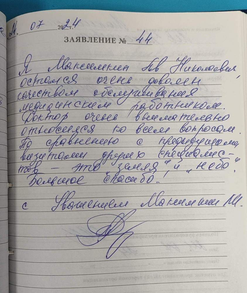 Я , Максимкин Лев Николаевич , остался очень доволен качеством обслуживания медицинским работником . Доктор очень внимательно относился ко всем вопросам. По сравнению с предыдущим визитами других специалистов - это "земля" и "небо".