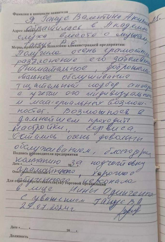 Я , Ганус Валентина Акимовна обратилась в Академию слуха вместе с мужем Ганус А.Е. Получила очень грамотное разъяснение его заболевания , внимательное , доброжелательное обслуживание . Тщательный подбор аппарата с учетом его индивидуальных и материальных возможностей .Возможность в дальнейшем проходить настройки , сервиса. Остались очень довольны обслуживанием , благодарим компанию за подготовку грамотного , хорошо обученного персонала в лице Нины Одинченко .
