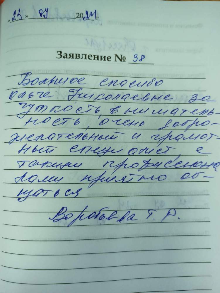 Большое спасибо Ольге Николаевне за чуткость , внимательность. Очень доброжелательный и грамотный специалист. С таким профессионалом приятно общаться. Воробьёва Т.Р.