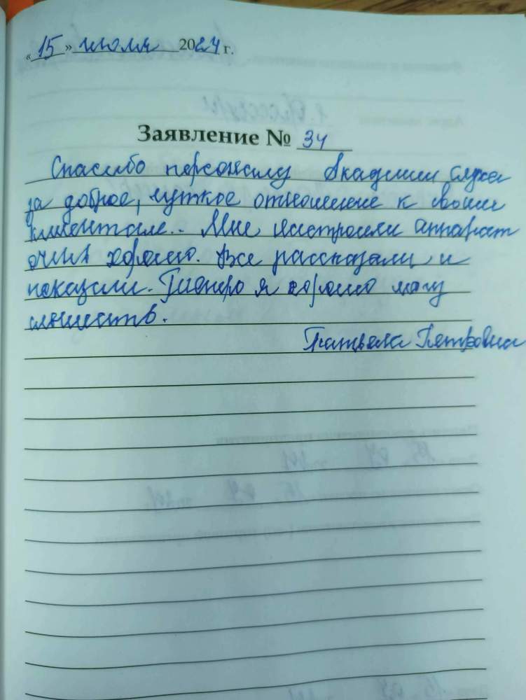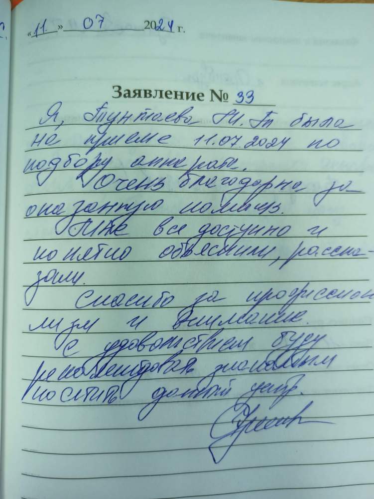 Я, Тунтаева М.Т. , была на приёме 11.07.2024. по подбору аппарата. Очень благодарна за оказанную помощь . Мне всё доступно объяснили, рассказали. Спасибо за профессионализм и внимание. С удовольствием буду рекомендовать своим знакомым посетить данный центр.