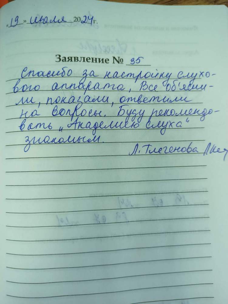 Спасибо за настройку слухового аппарата. Всё объяснили, показали, ответили на вопросы. Буду рекомендовать Академию Слуха знакомы. Л. Тлегенова.