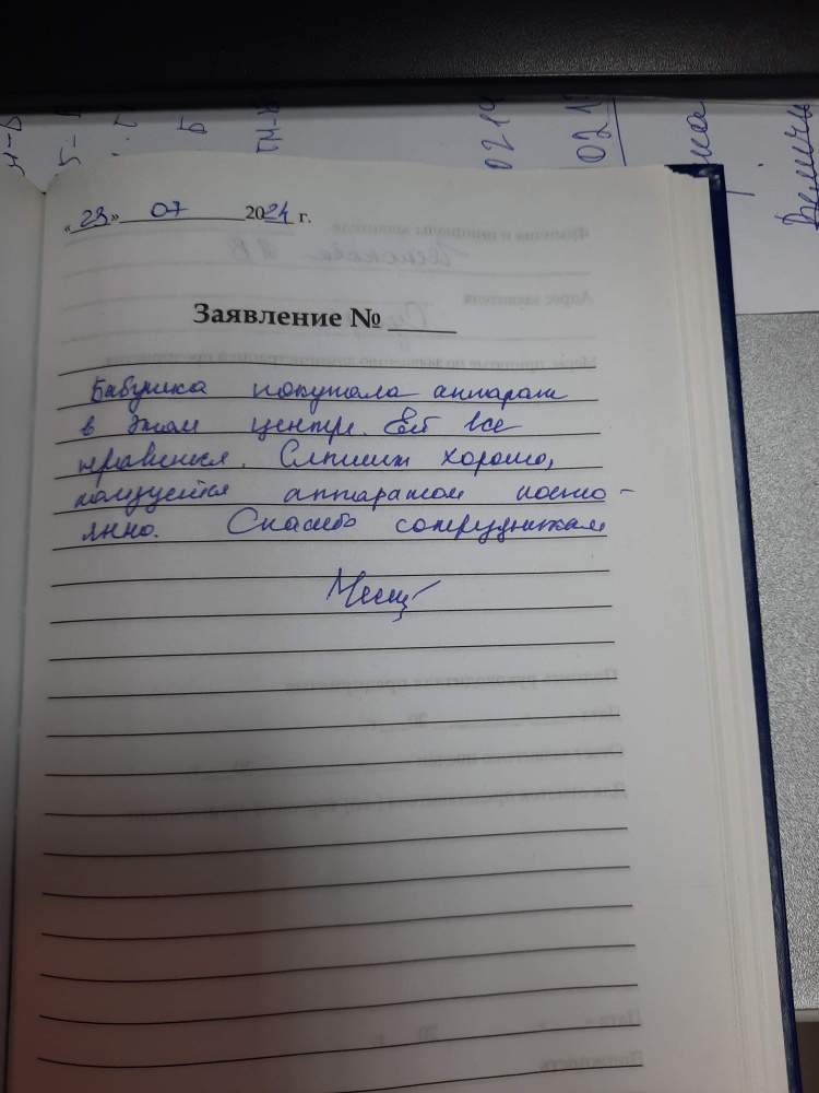 Я, Тунтаева М.Т. , была на приёме 11.07.2024. по подбору аппарата. Очень благодарна за оказанную помощь . Мне всё доступно объяснили, рассказали. Спасибо за профессионализм и внимание. С удовольствием буду рекомендовать своим знакомым посетить данный центр.