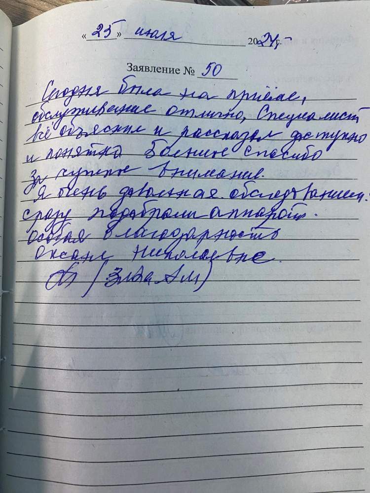 Сегодня была на приеме, обслуживание отлично. Специалист всё объяснил и рассказал доступно и понятно. Большое спасибо за чуткое внимание. Я очень довольная обслуживанием: сразу подобрали аппарат. Особая благодарность Оксане Николаевне.