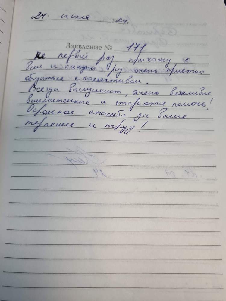 Я, Данилина Любовь Ивановна хочу объявить благодарность за хорошее и чуткое обращение, с нами пациентами, очень внимательны и очень хорошее обращение.