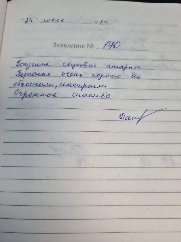 Получила слуховой аппарат. Персонал очень хорошо всё объяснили, настроили. Огромное спасибо